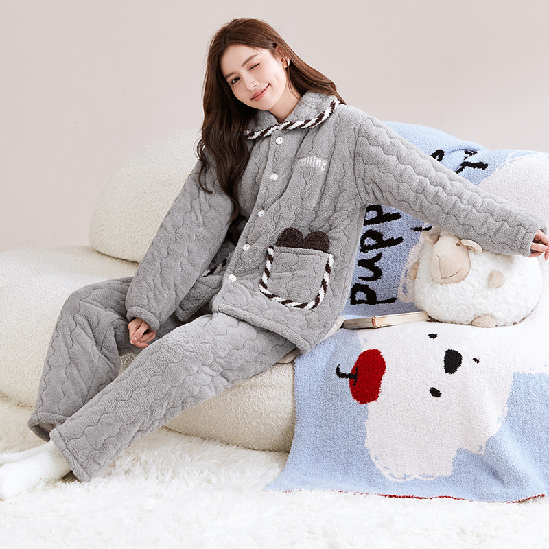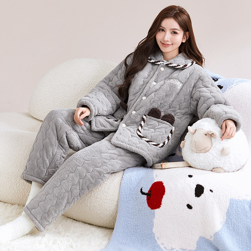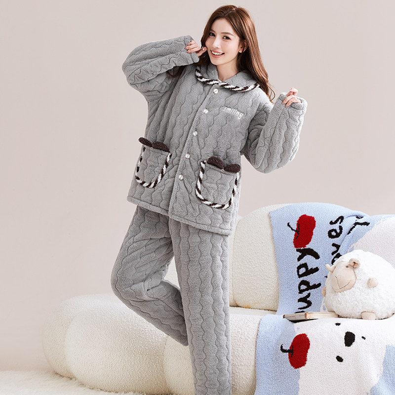 睡衣女冬季加绒加厚法兰绒家居服保暖套装大码三层夹棉可外穿棉袄