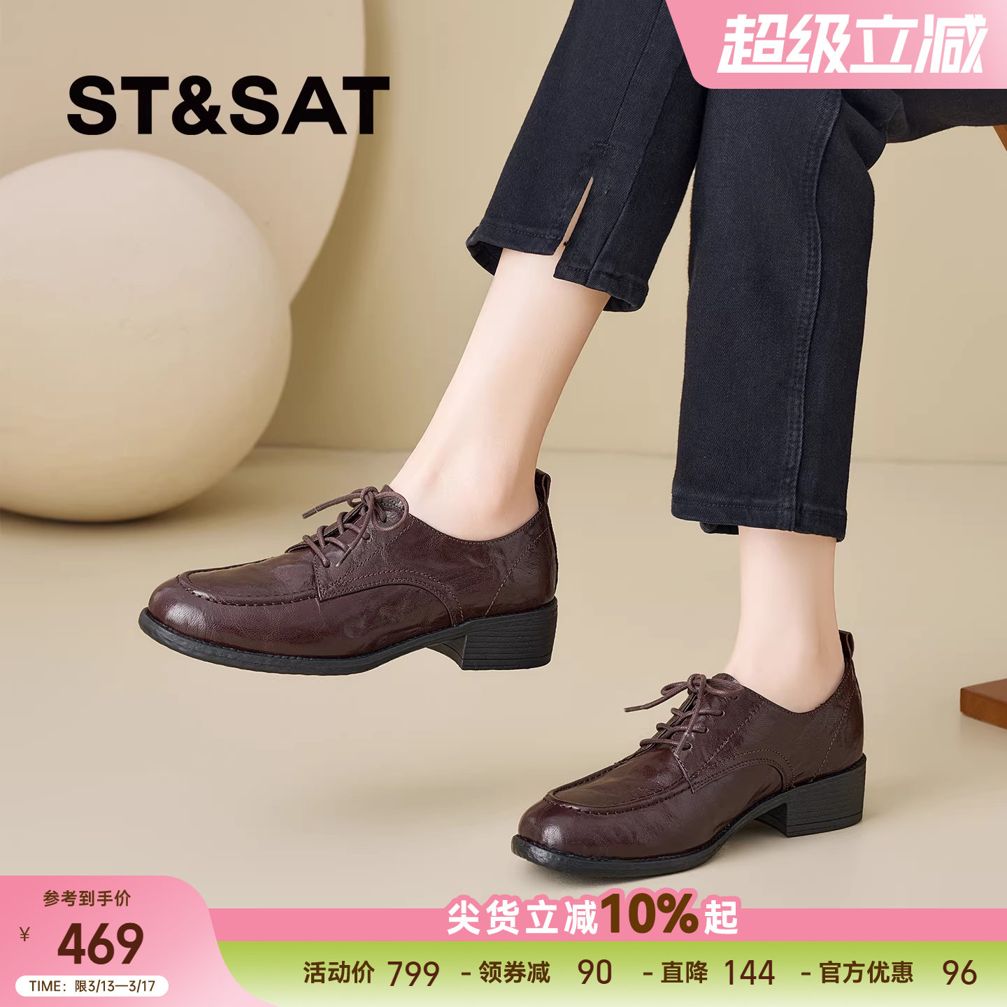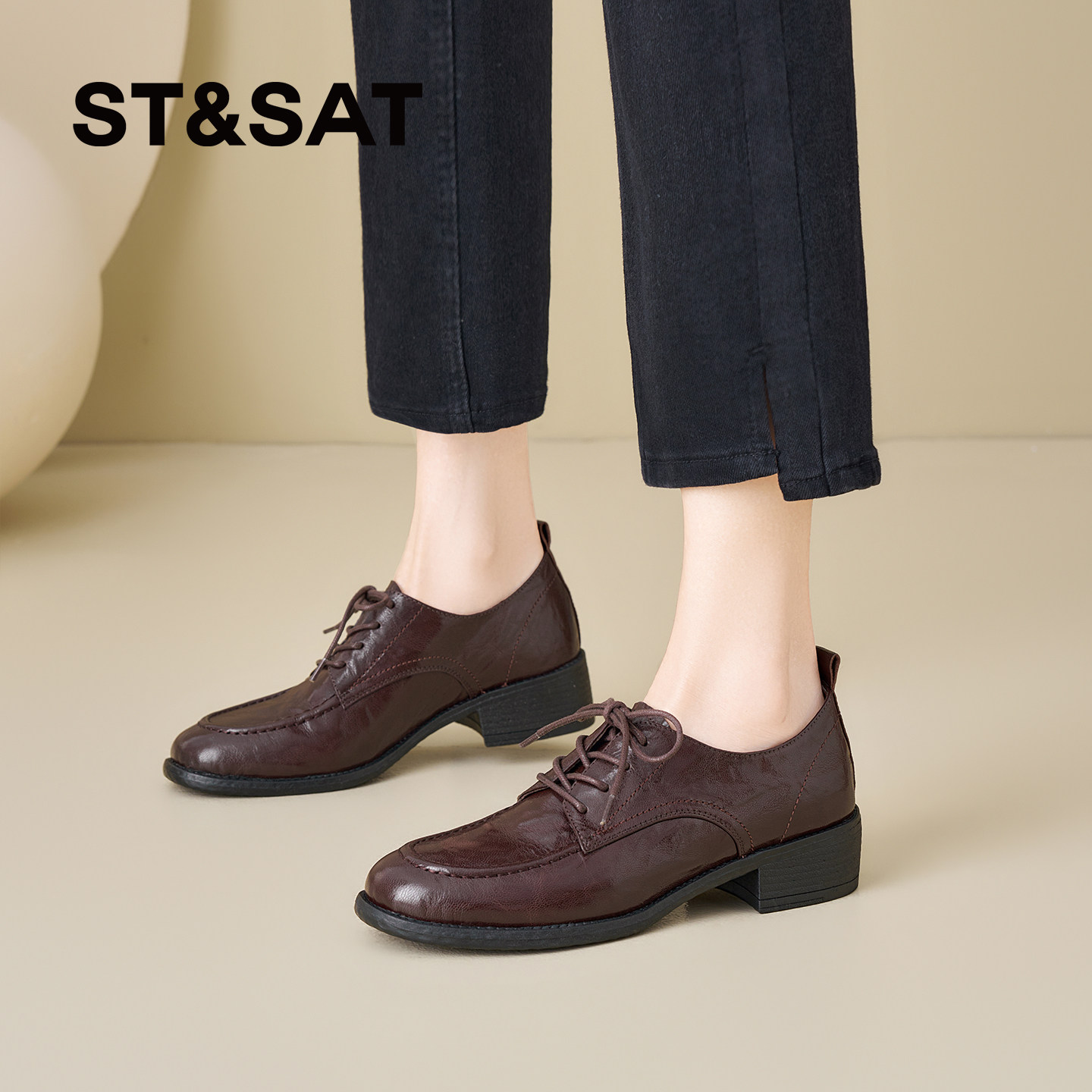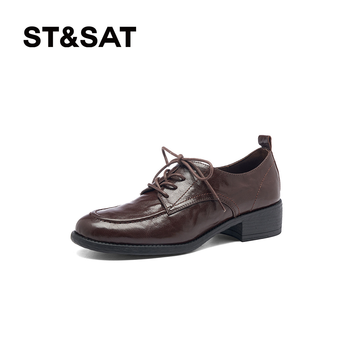 星期六粗跟乐福鞋女2026新款圆头系带黑色真皮舒适软底深口女单鞋