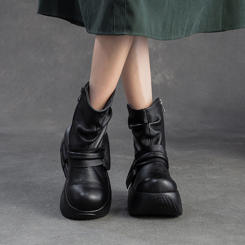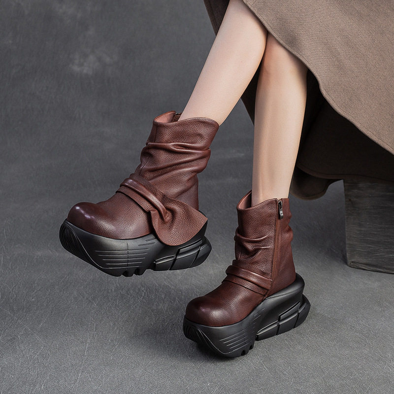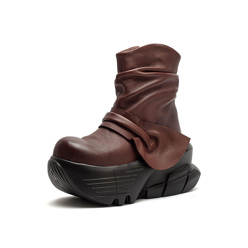 头层牛皮松糕厚底短靴子复古真皮女鞋2025秋冬新款欧美高跟马丁靴