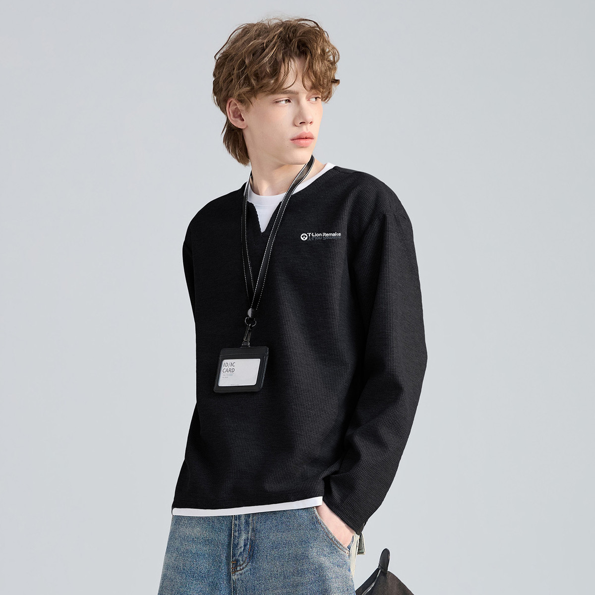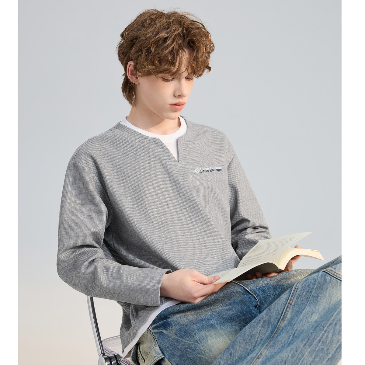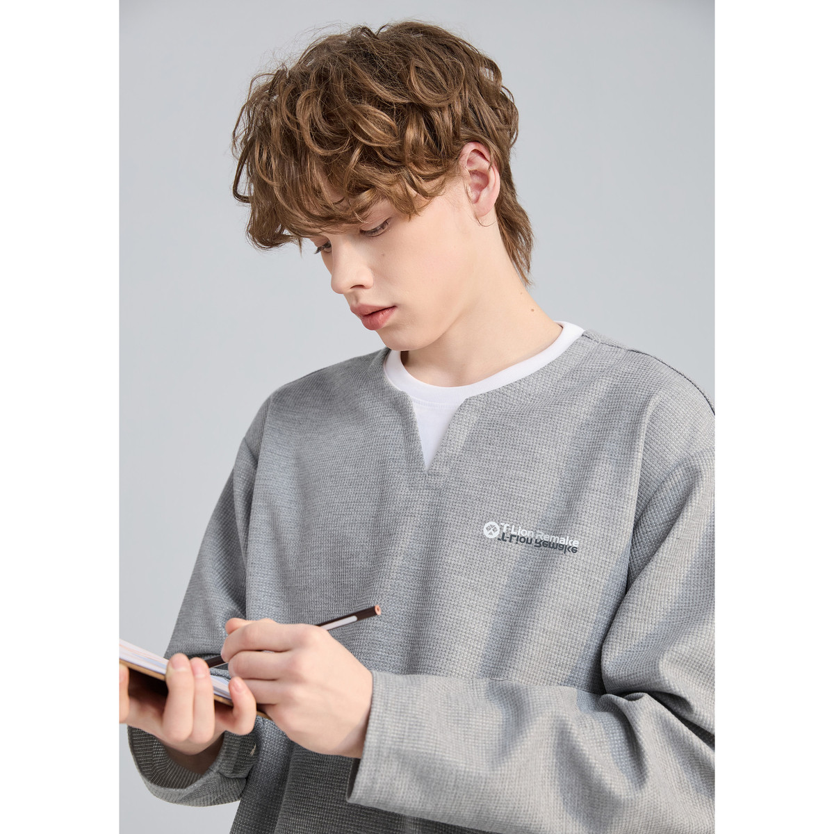 唐狮2026春季新款长袖T恤男款假两件圆领字母设计华夫格灰色男士