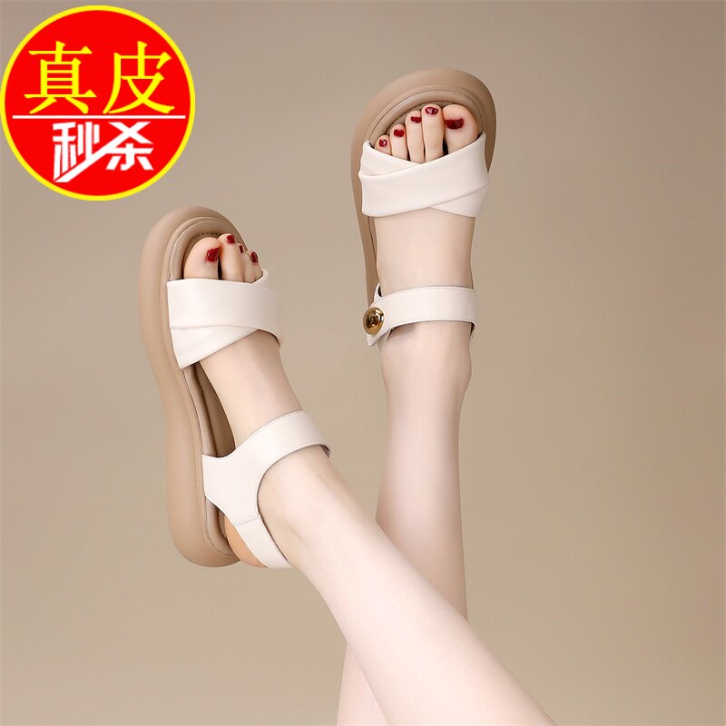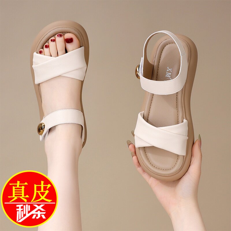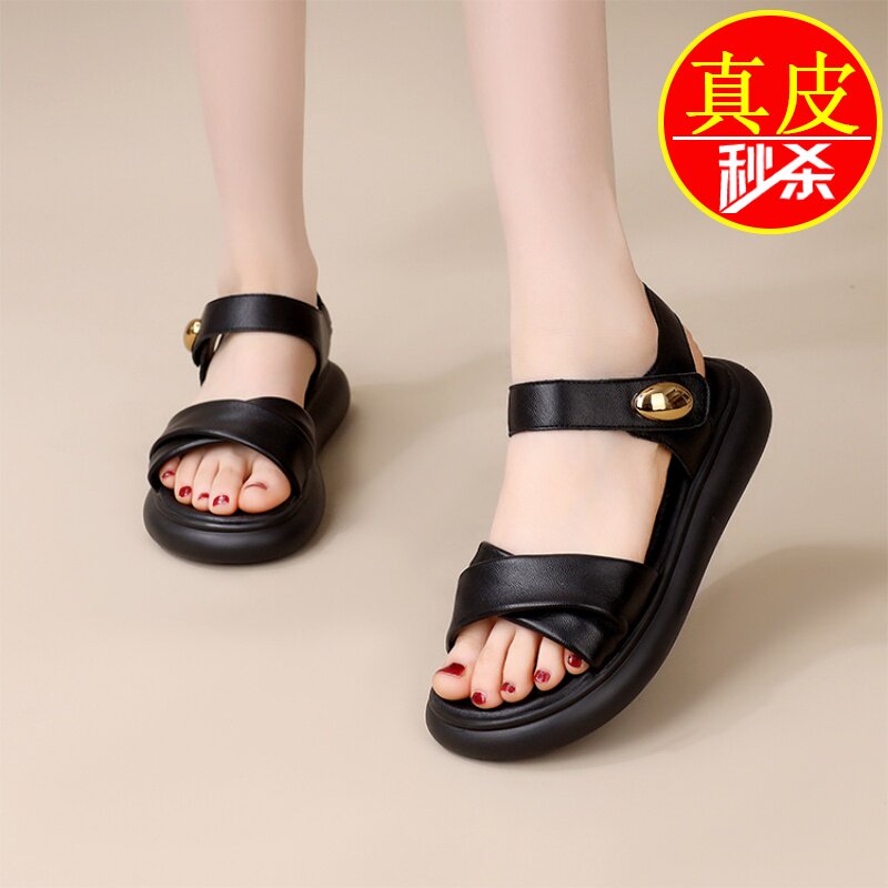 品牌真皮厚底凉鞋女夏季2025新款软底平底不累脚罗马鞋防滑沙滩鞋