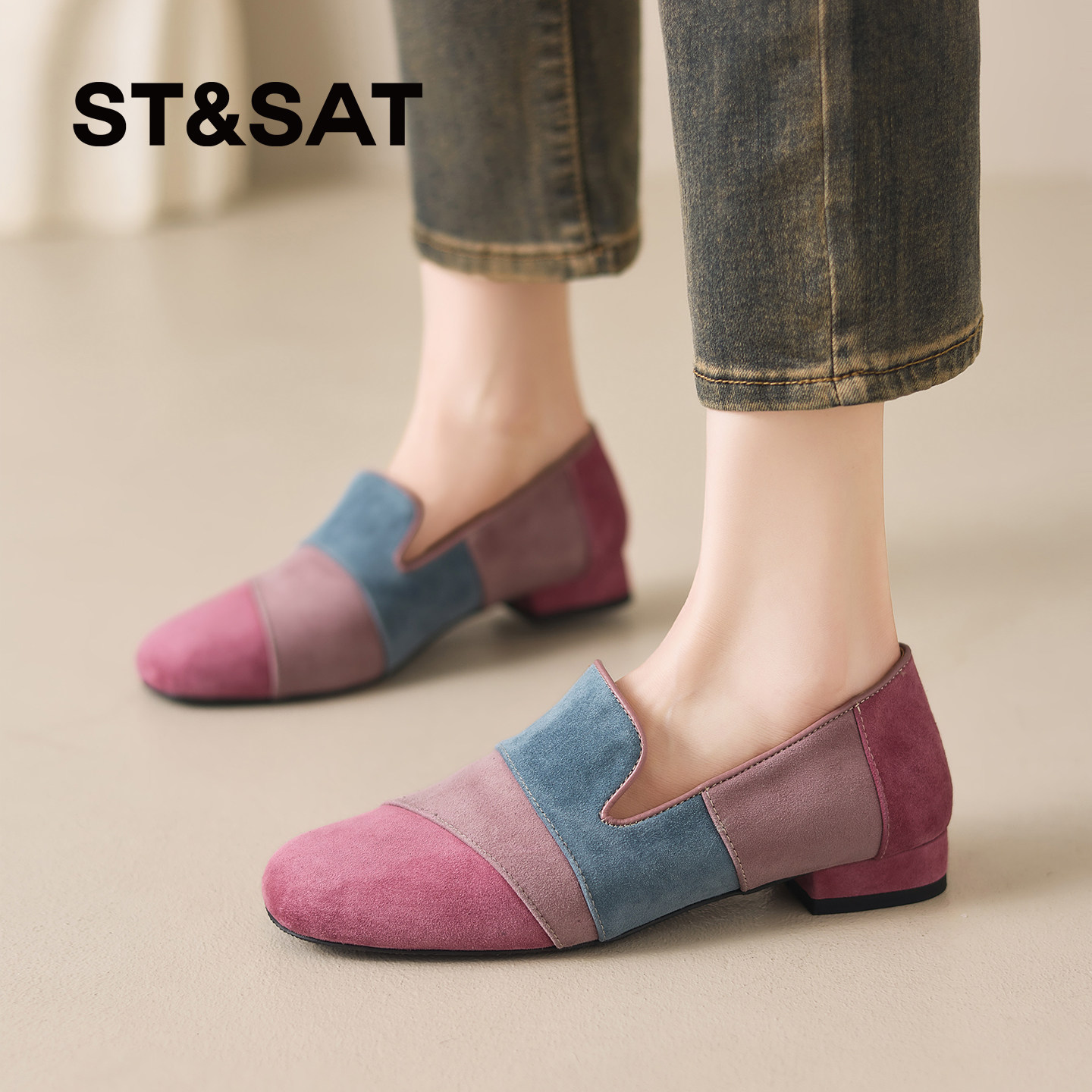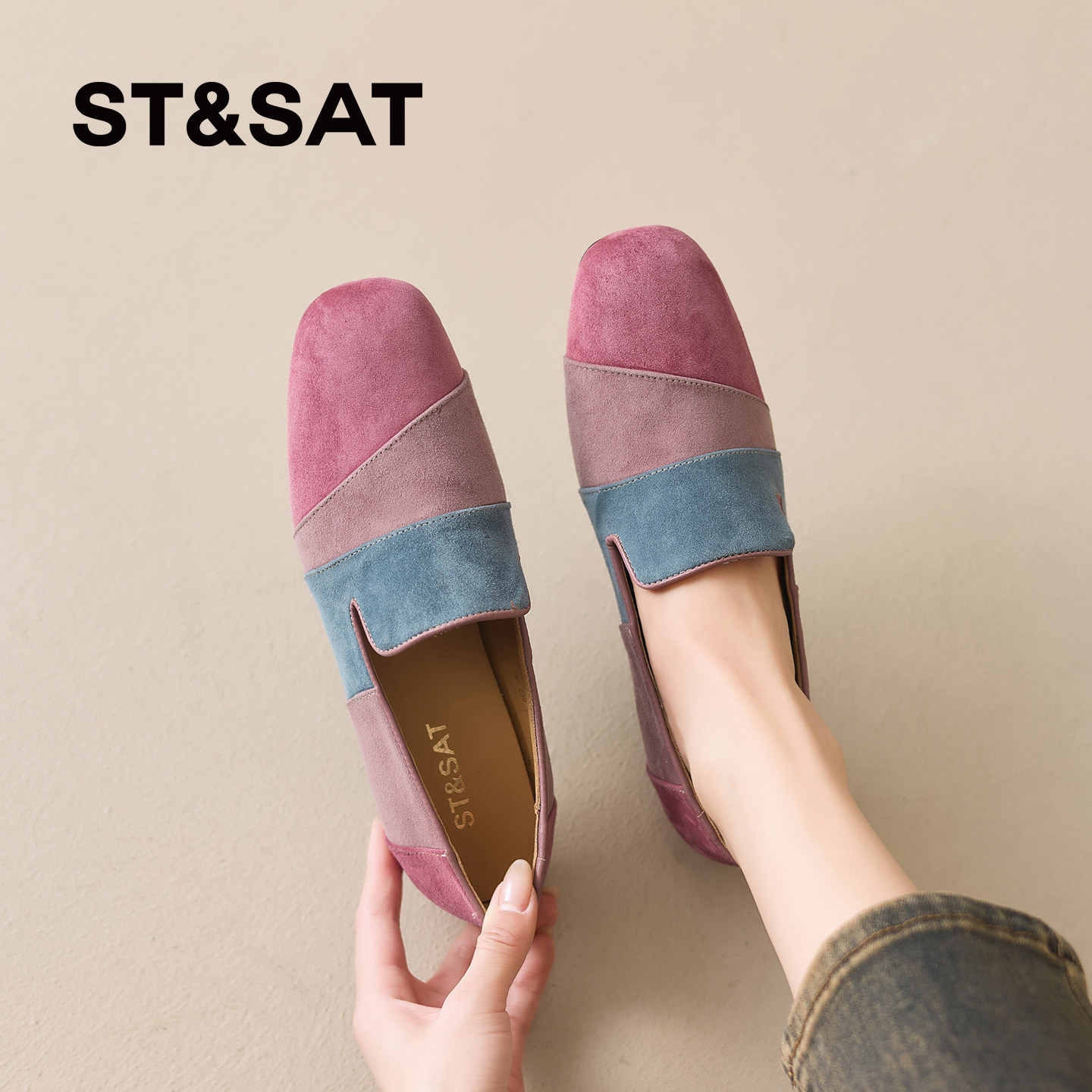 星期六拼色一脚蹬乐福鞋女2026新款巨好看真皮方头懒人鞋平底单鞋