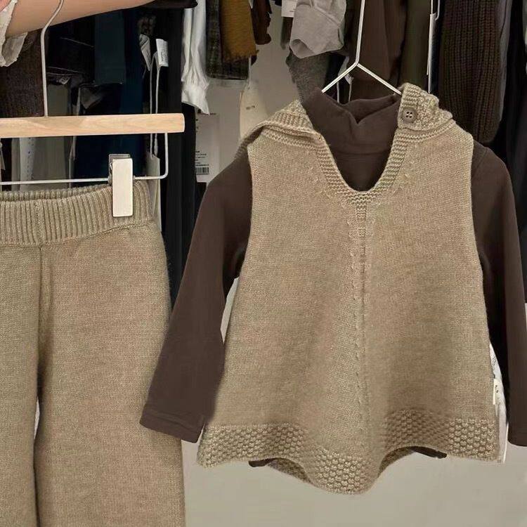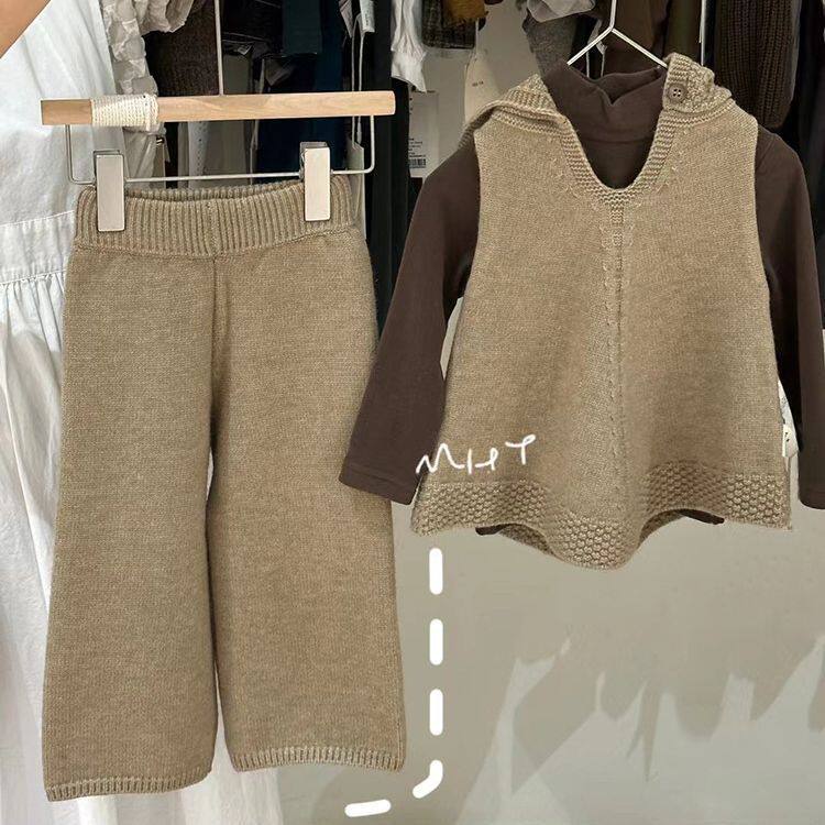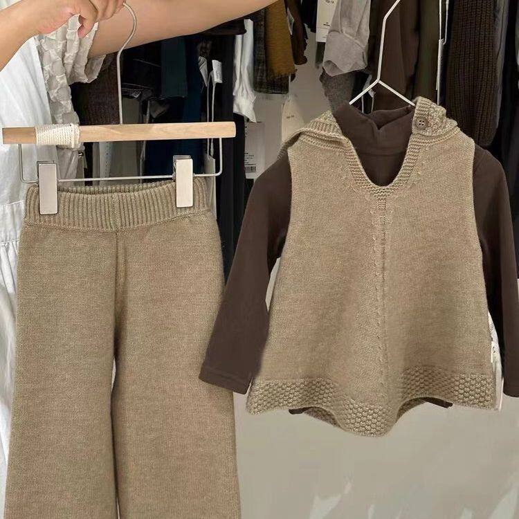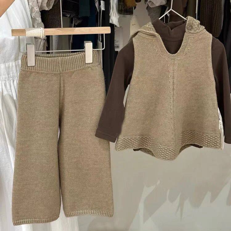 韩国童装儿童春秋新款纯色连帽马甲毛衣两件套女童阔腿裤针织套装