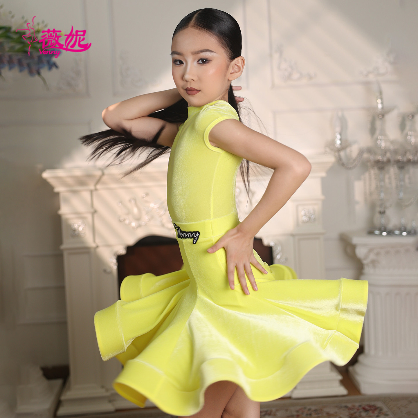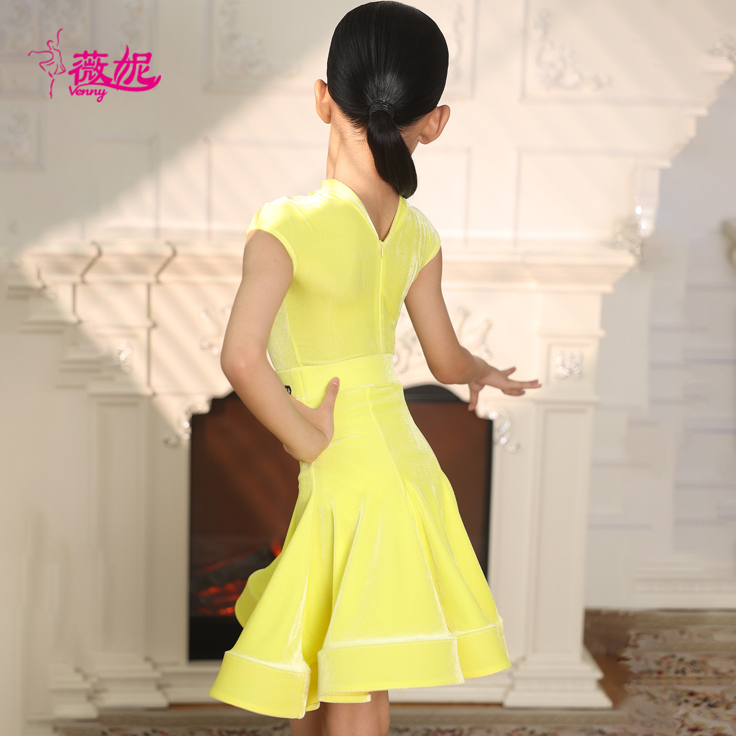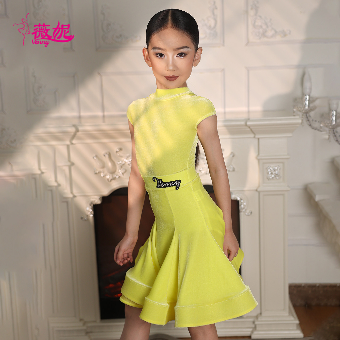 薇妮拉丁舞服儿童高级定制演出比赛规定服短袖小高领丝绒国标舞裙