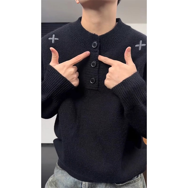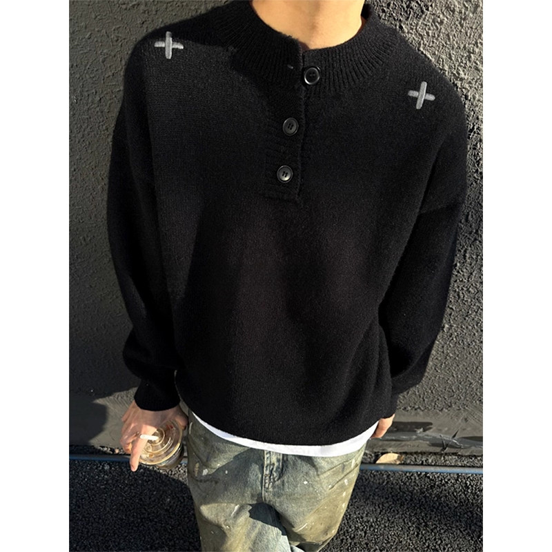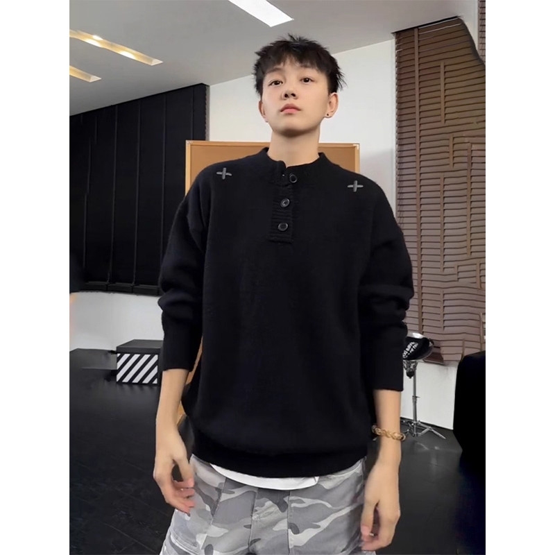 十字黑色美式亨利领毛衣男女款秋冬慵懒高级感针织衫加厚打底内搭