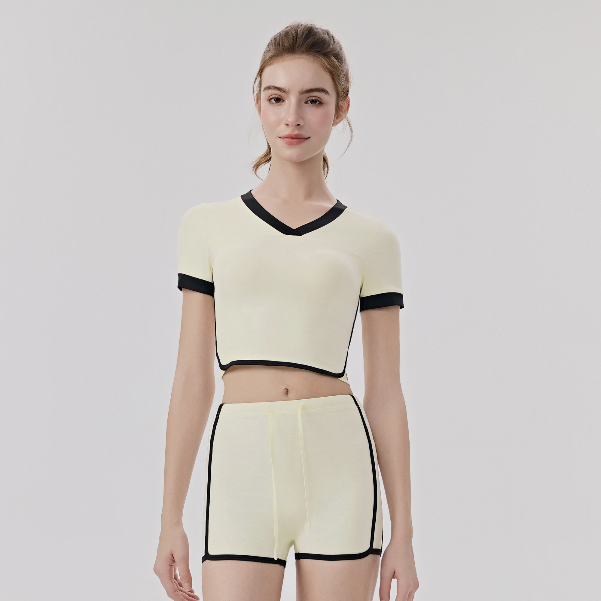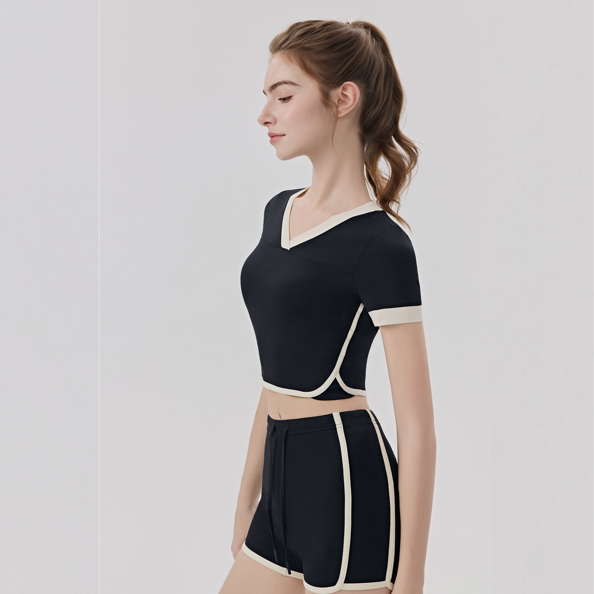 UMAY佑美健身套装女士V领撞色短袖上衣裤子瑜伽网球运动服两件套