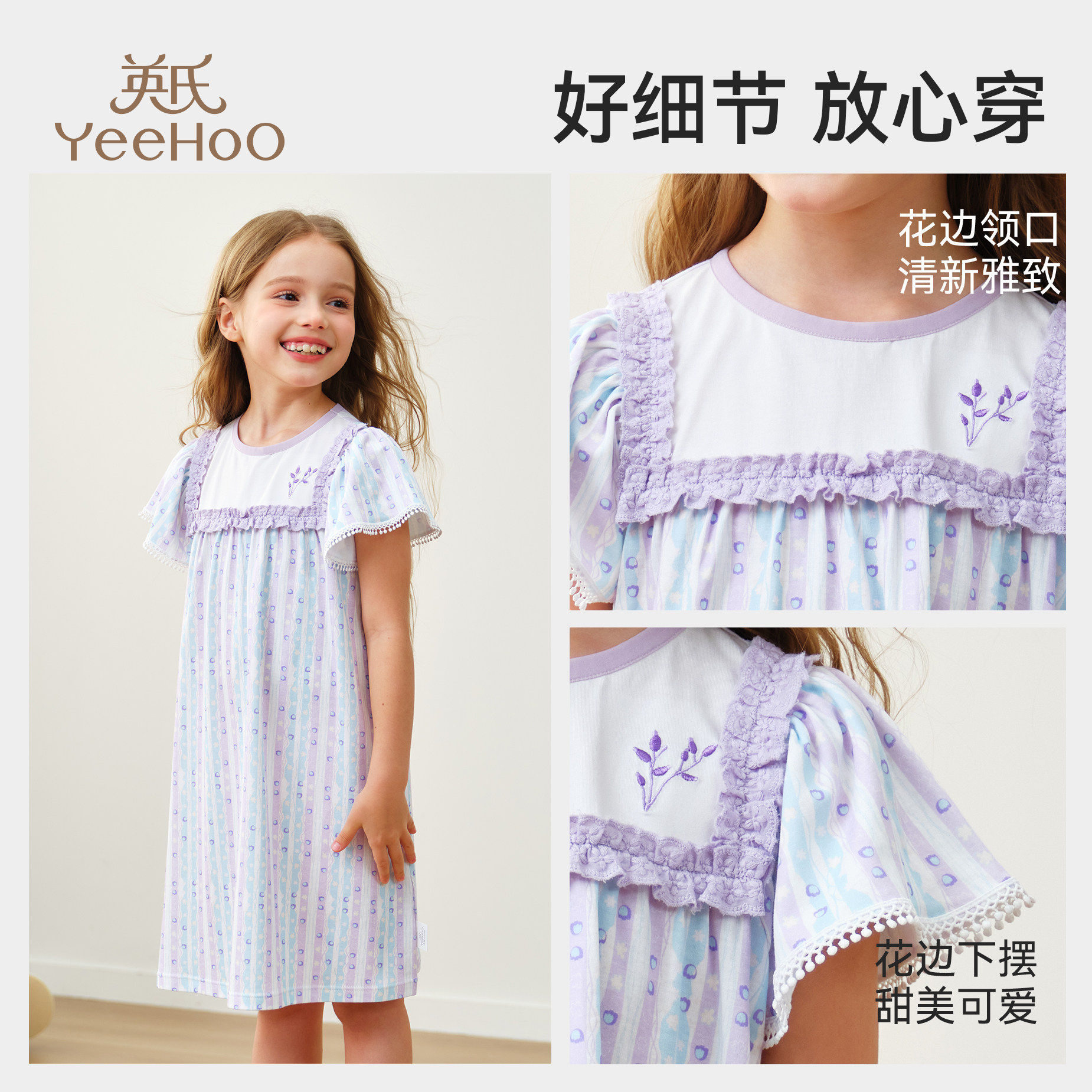 英氏儿童睡裙夏季薄款100%纯棉短袖连衣裙全棉公主风睡衣女童裙子