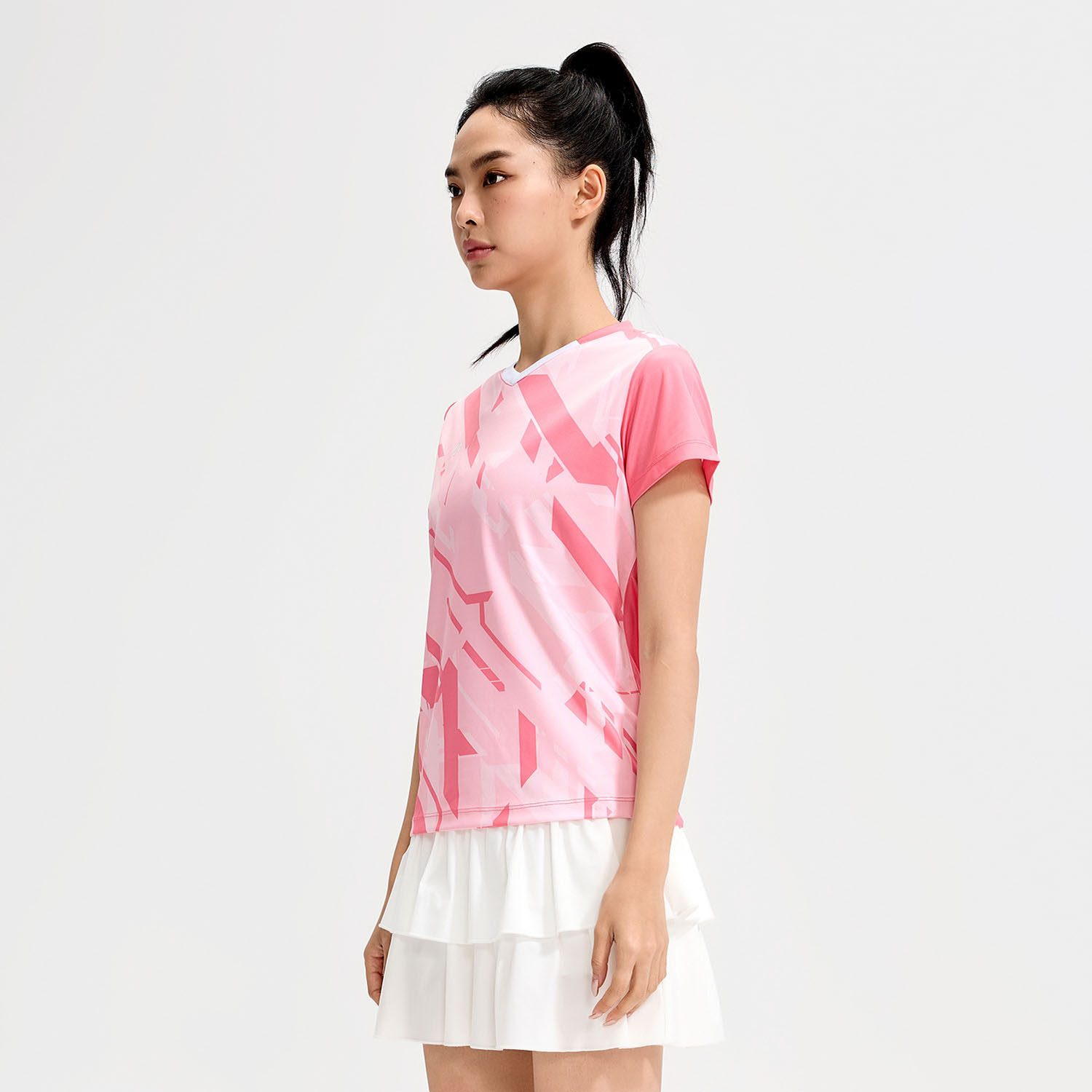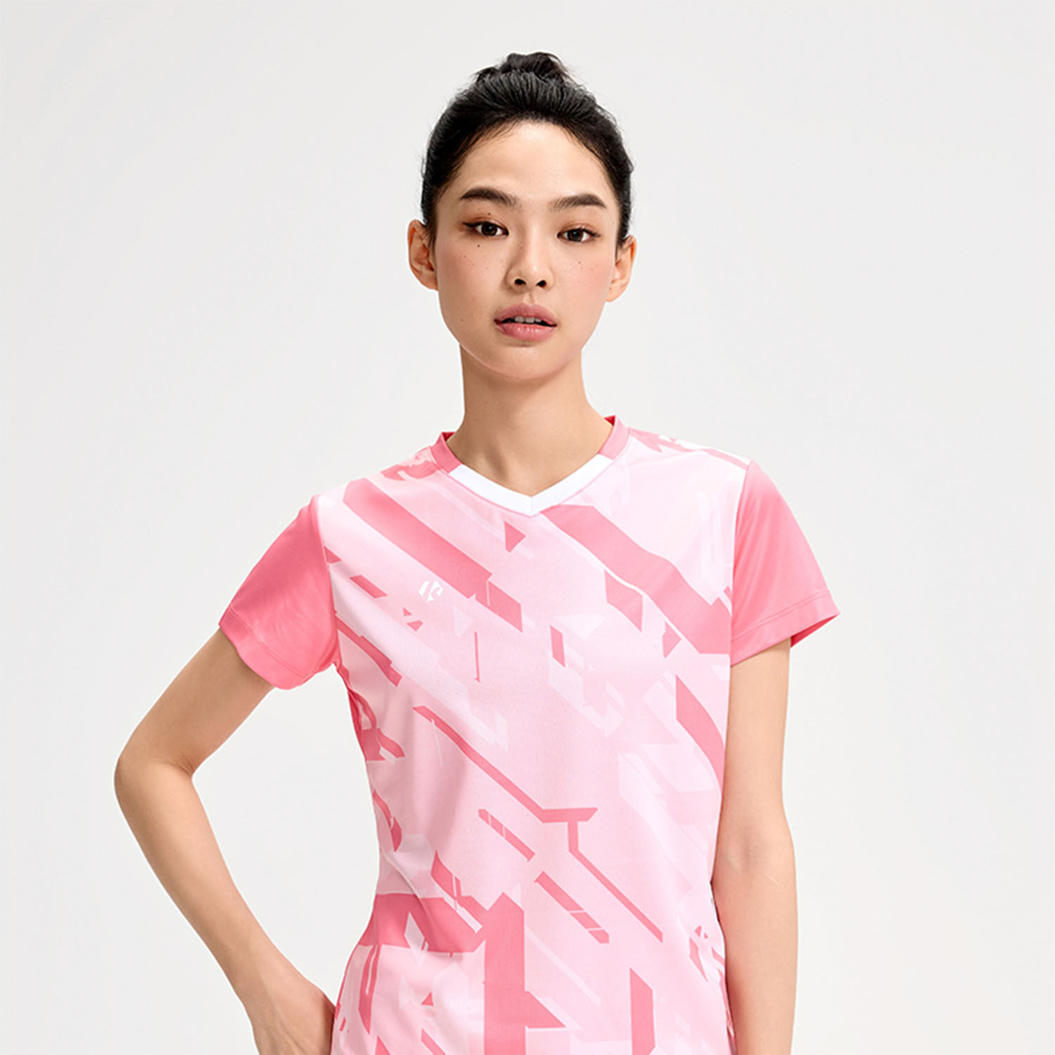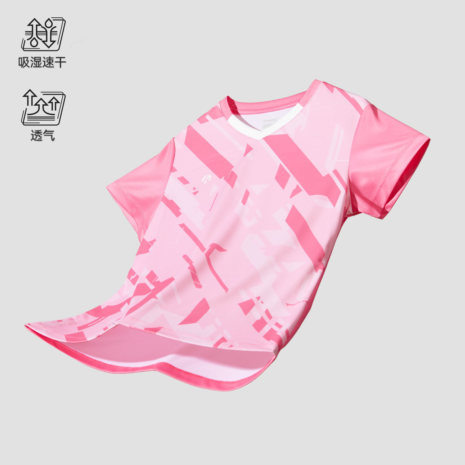 kawasaki川崎羽毛球服女速干透气运动短袖T恤粉色几何印花上衣