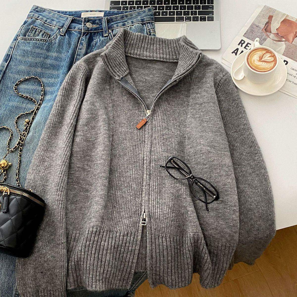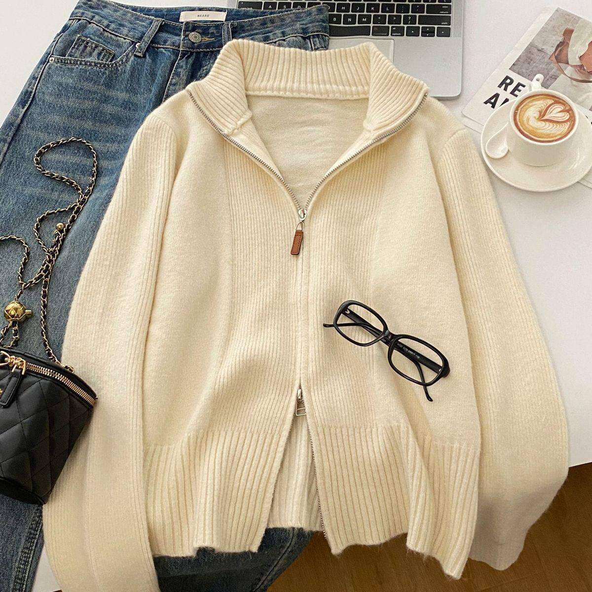 双拉链高领针织开衫毛衣女款2026年秋冬新款多巴胺穿搭小个子内搭