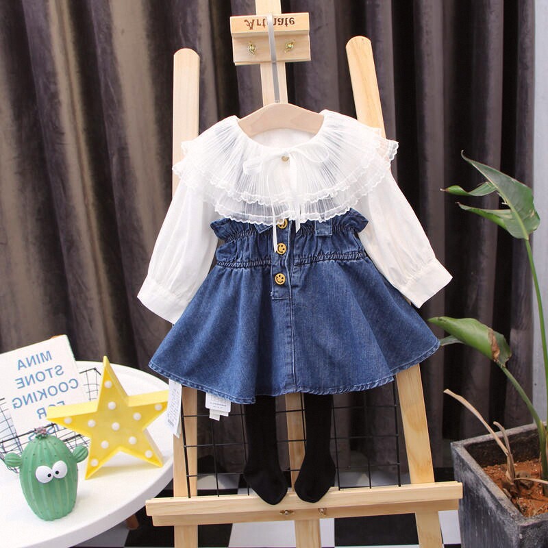 春装女童连衣裙套装女宝宝花边衬衣打底衫中小童牛仔公主裙子新款