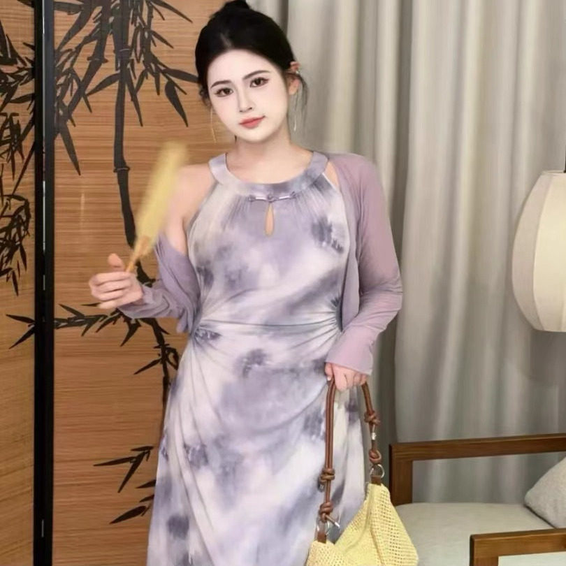 大码胖mm显瘦新中式气质开衫网纱连衣裙女夏季复古国风禅意套装裙