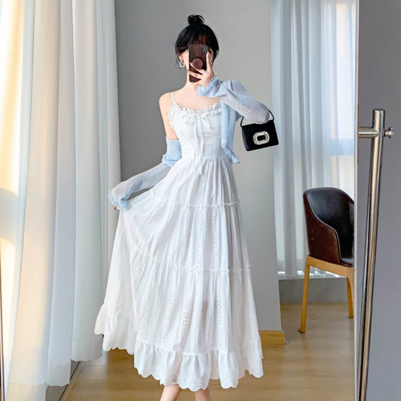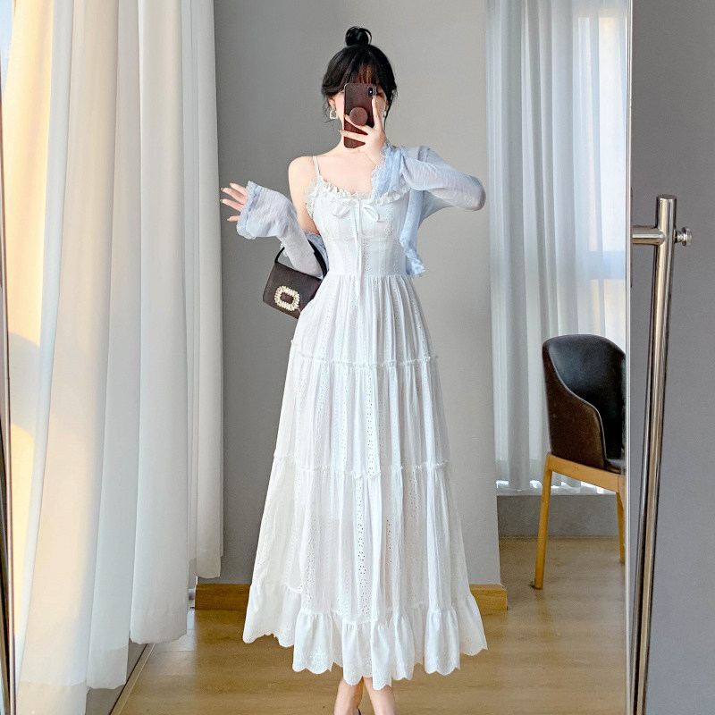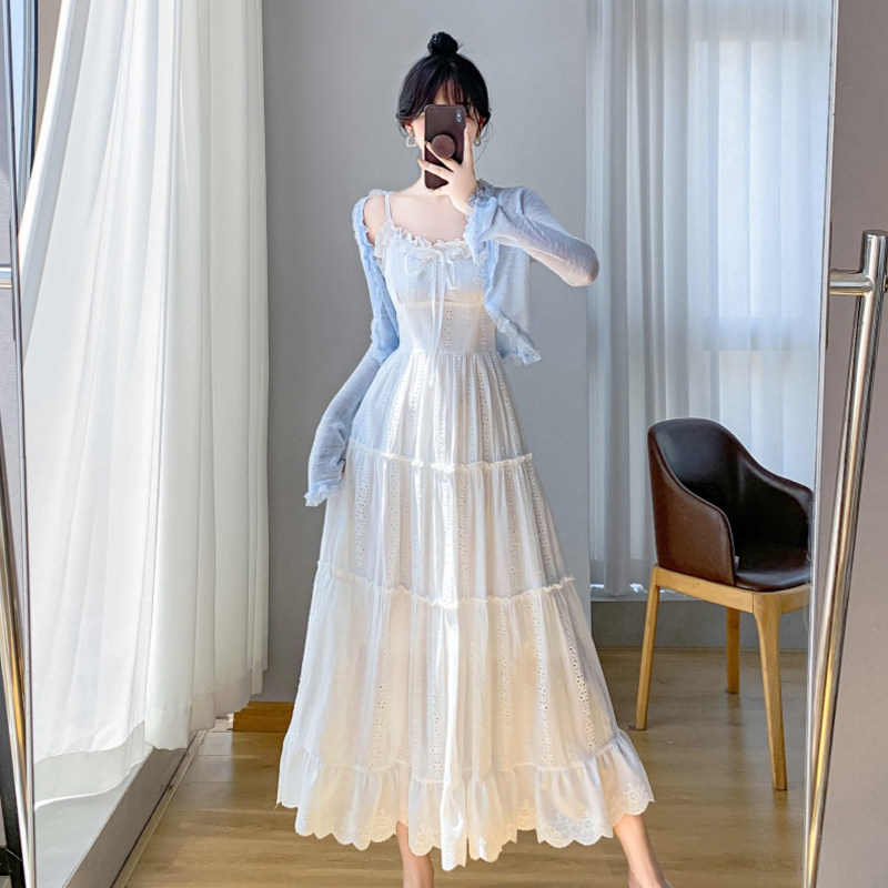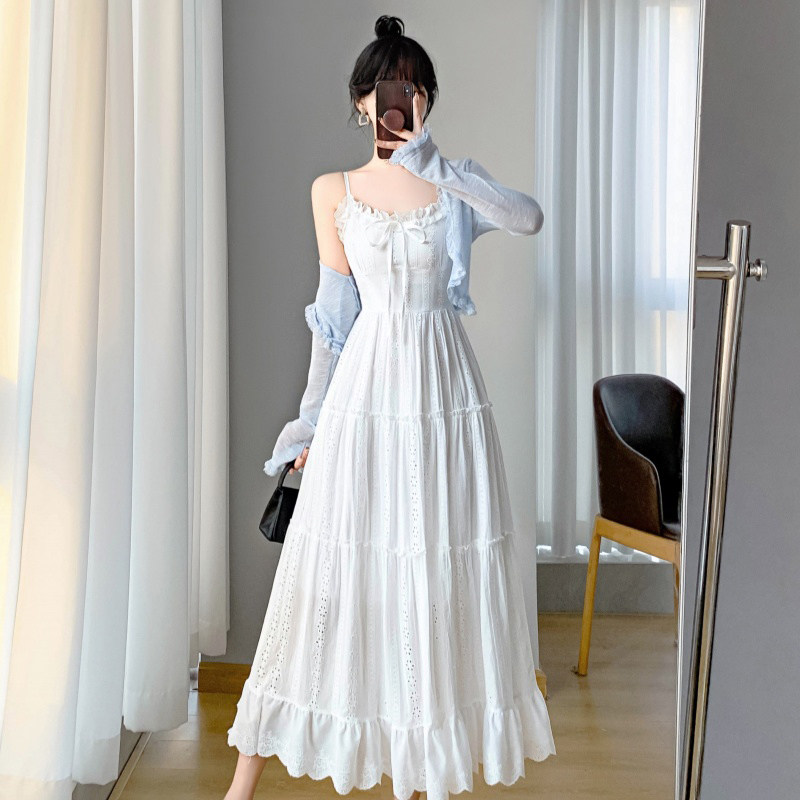 法式初恋白色吊带连衣裙子开衫两件套装夏季海边度假仙女绝美长裙