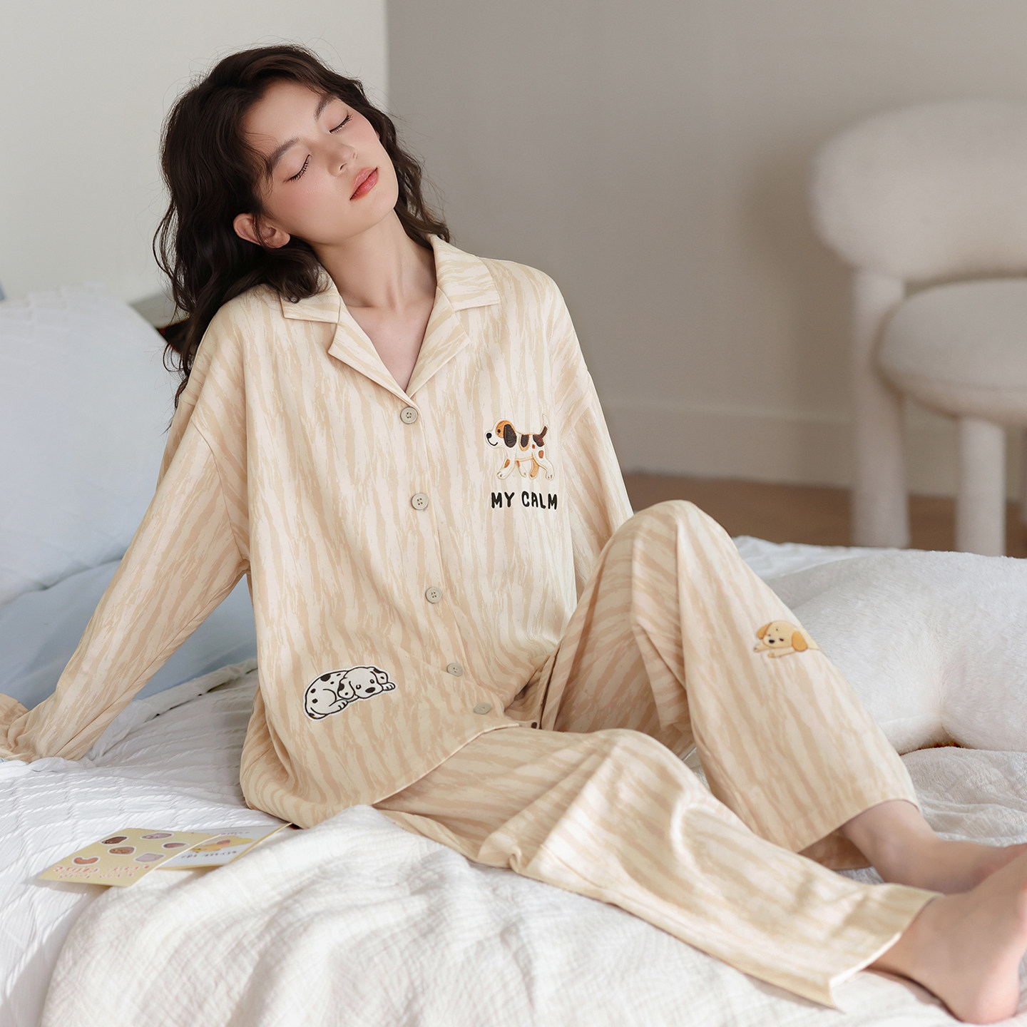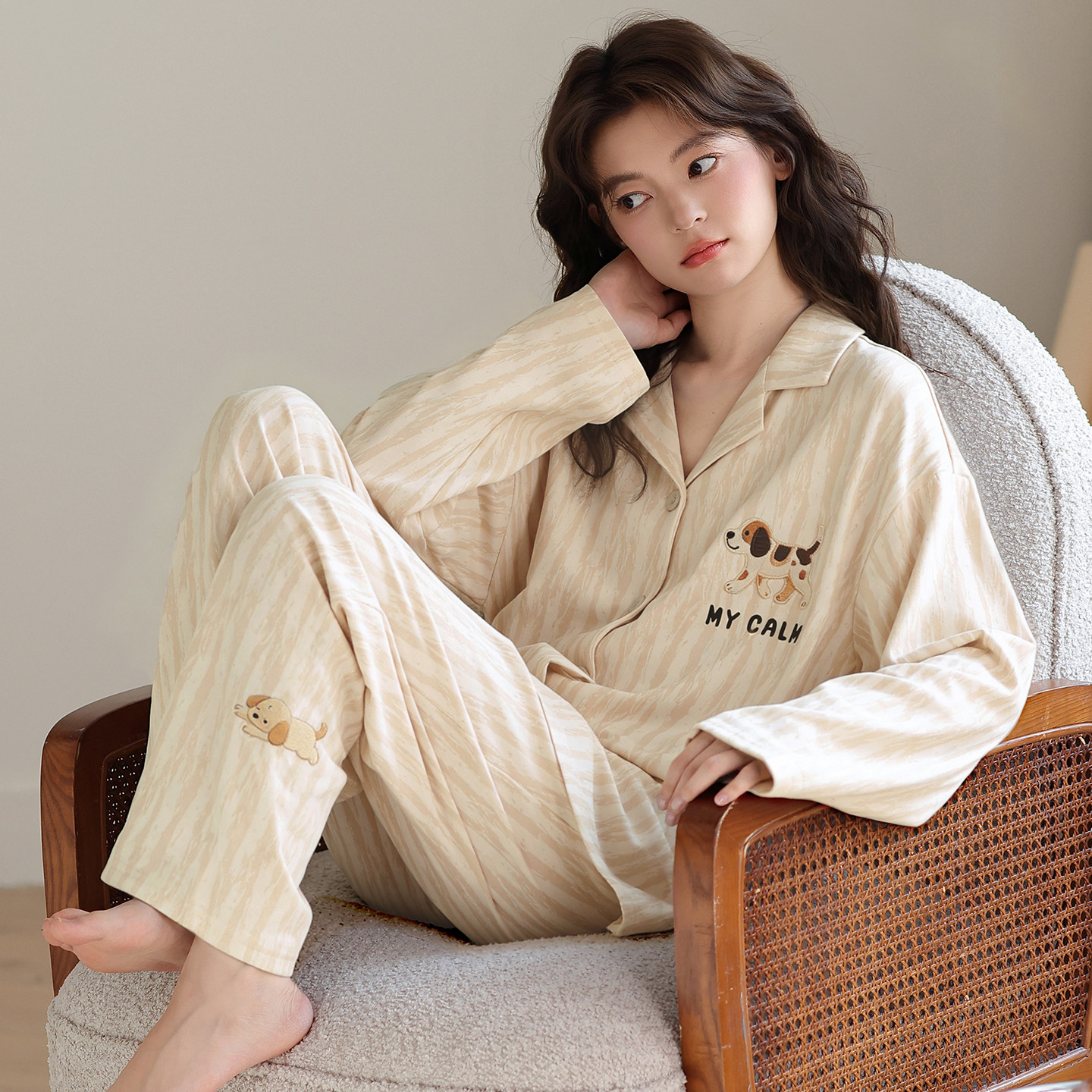 100%纯棉睡衣女款春秋季长袖2026新款韩版卡通小狗条纹家居服套装