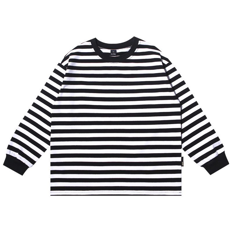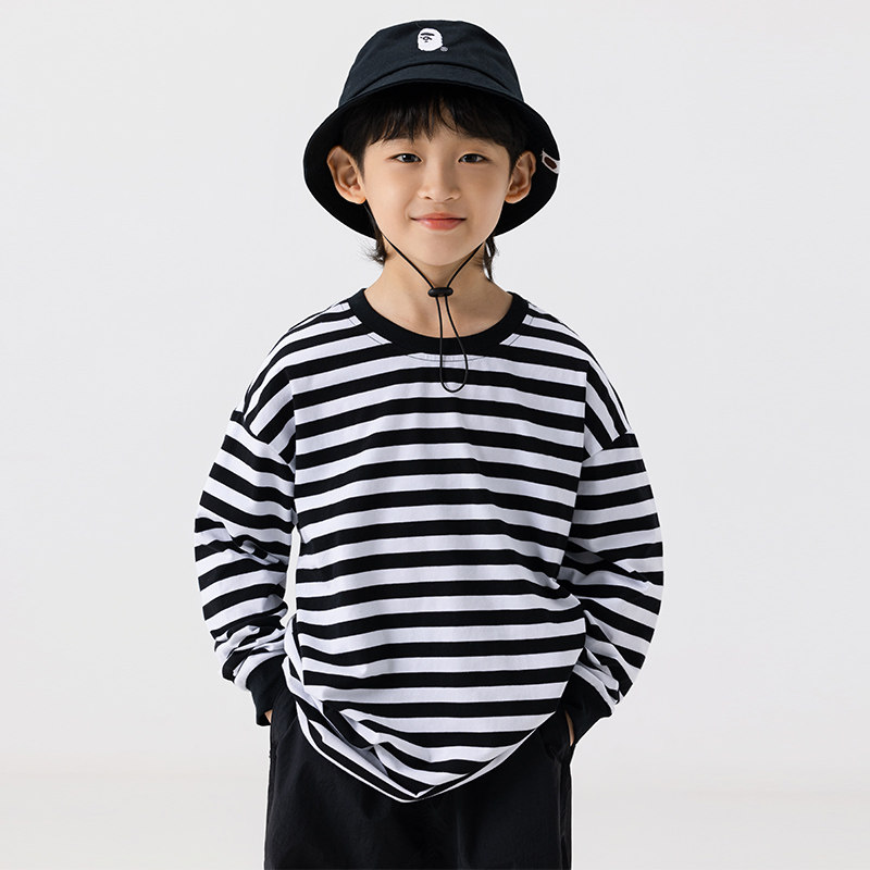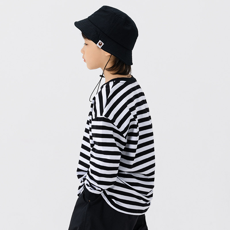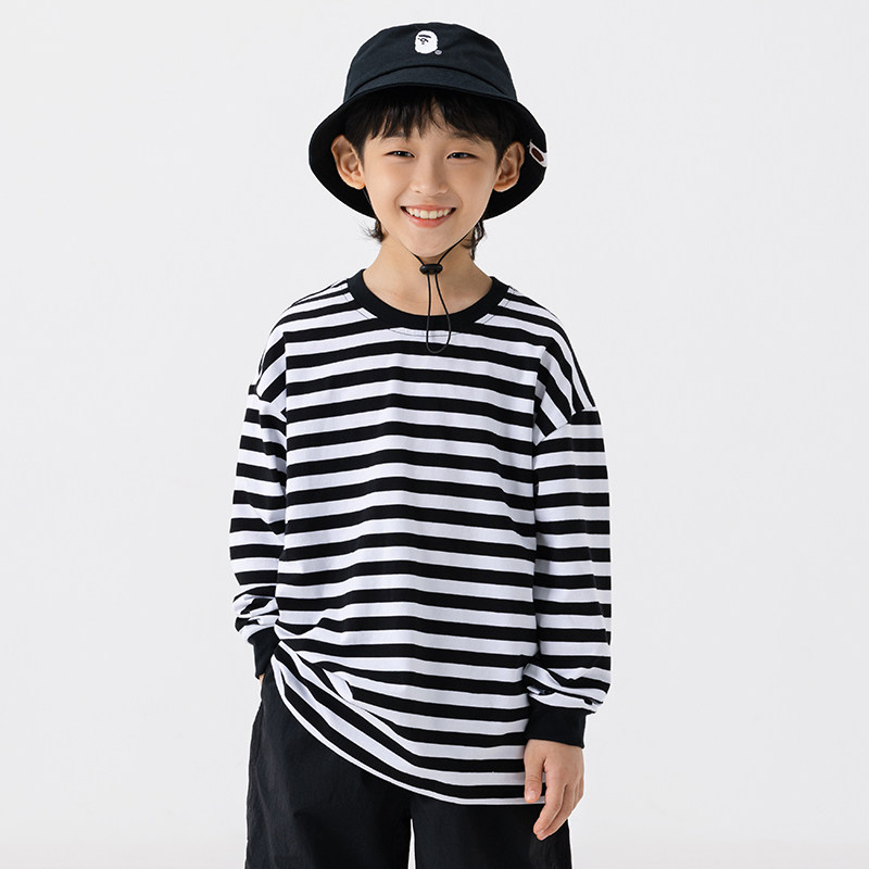 日系儿童简约黑白条纹T恤长袖打底衫男童春秋针织街舞上衣潮童装