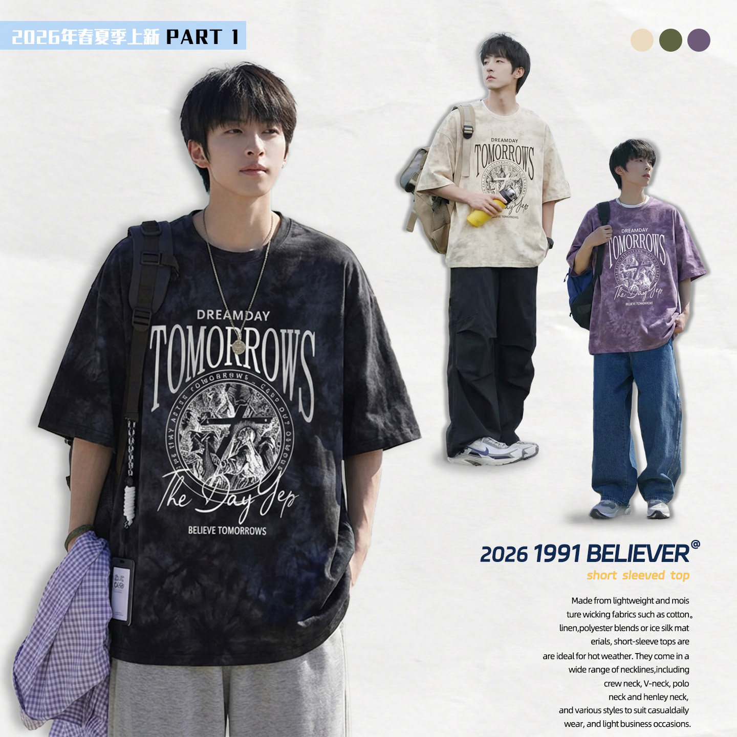 男t恤短袖美式复古扎染青少年宽松半袖高街大码圆领潮流上衣体恤