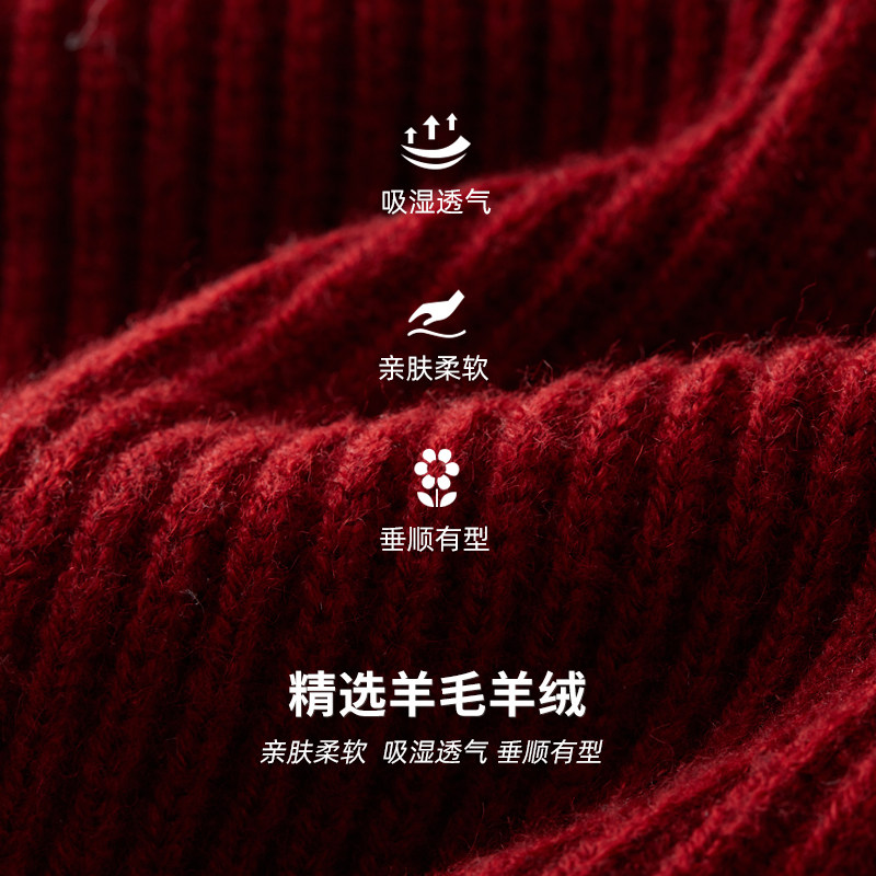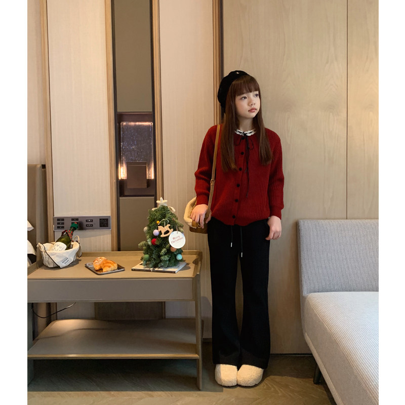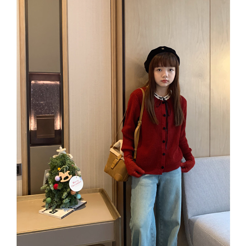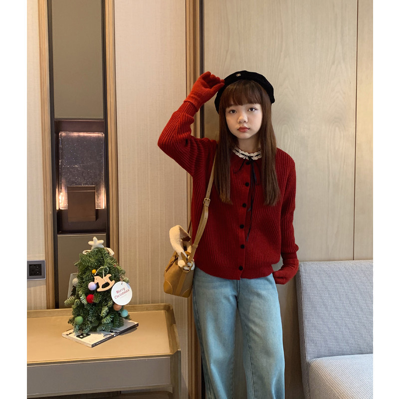 女大童新年红韩版开衫2024冬装新款青少年蕾丝边毛衣年货款针织衫