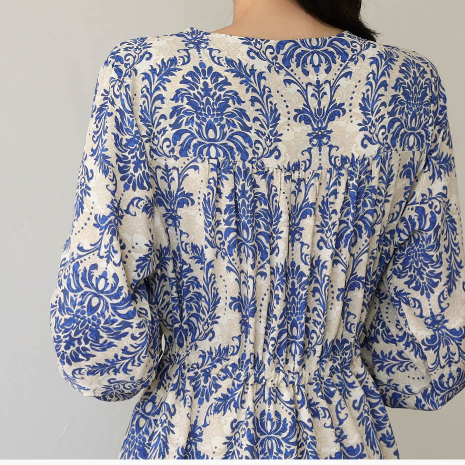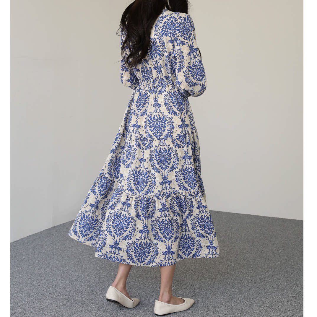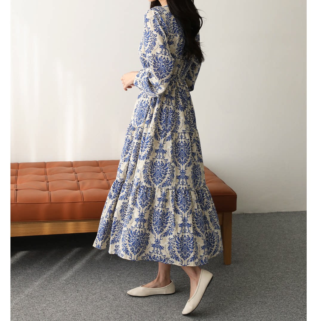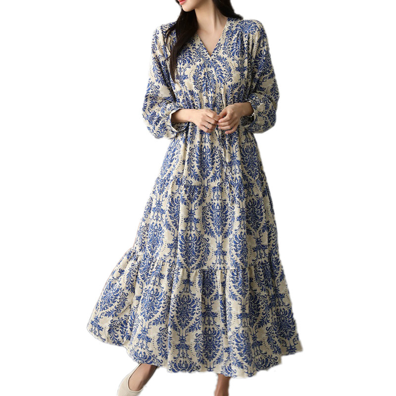 韩版大码女装V领长袖复古印花宽松遮肚连衣裙系带腰修身过膝长裙