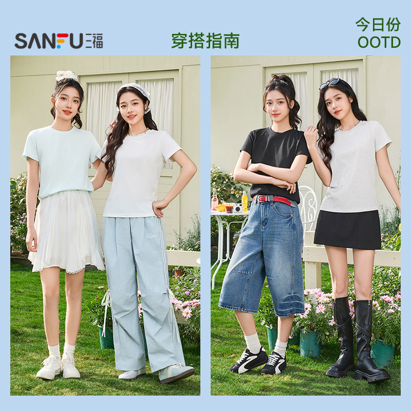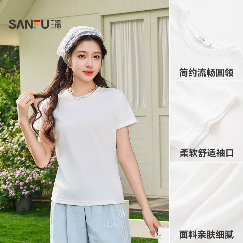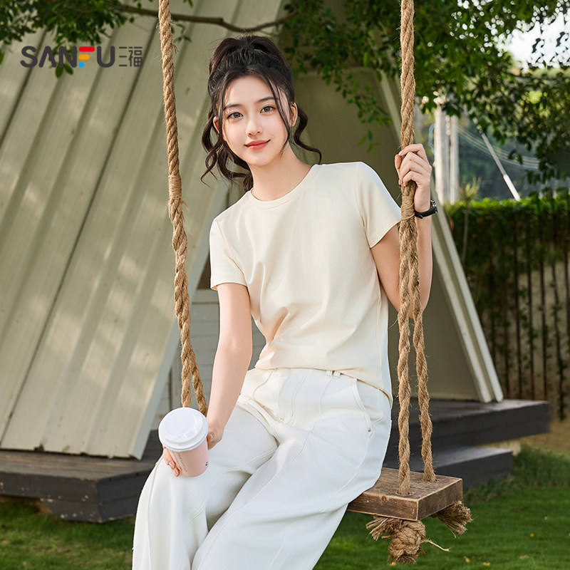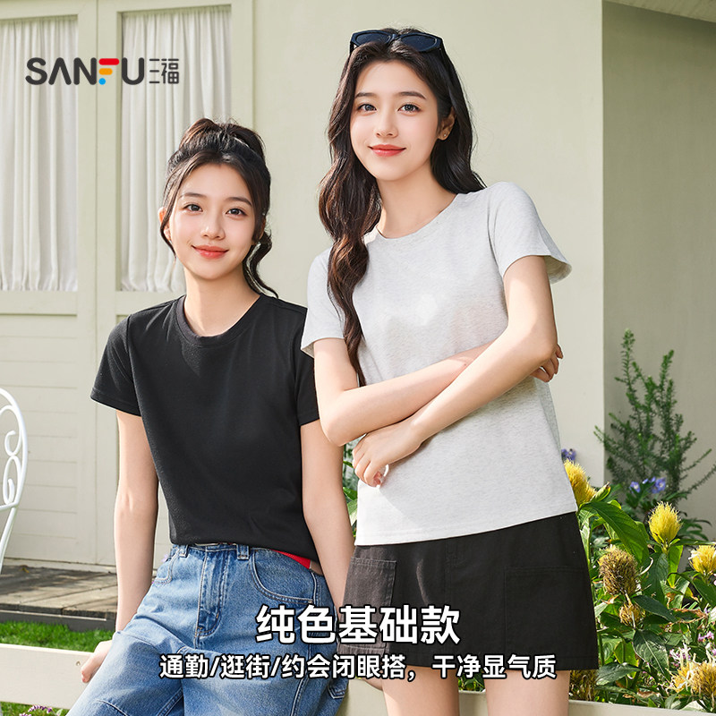 三福T恤女2026新款夏季简约休闲纯色短袖圆领时尚小个子上衣女装