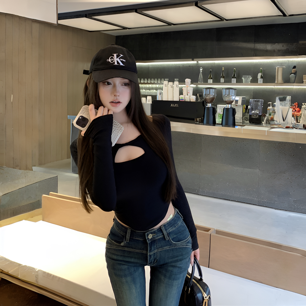 纯欲风设计感小众气质打底衫长袖女修身显瘦秋冬新款镂空别致上衣