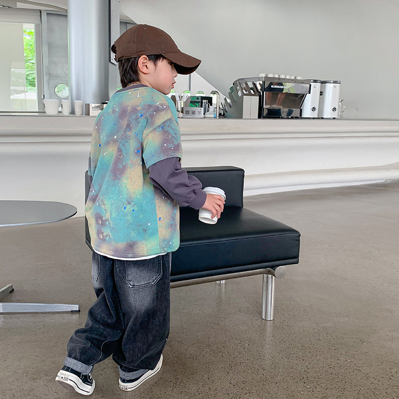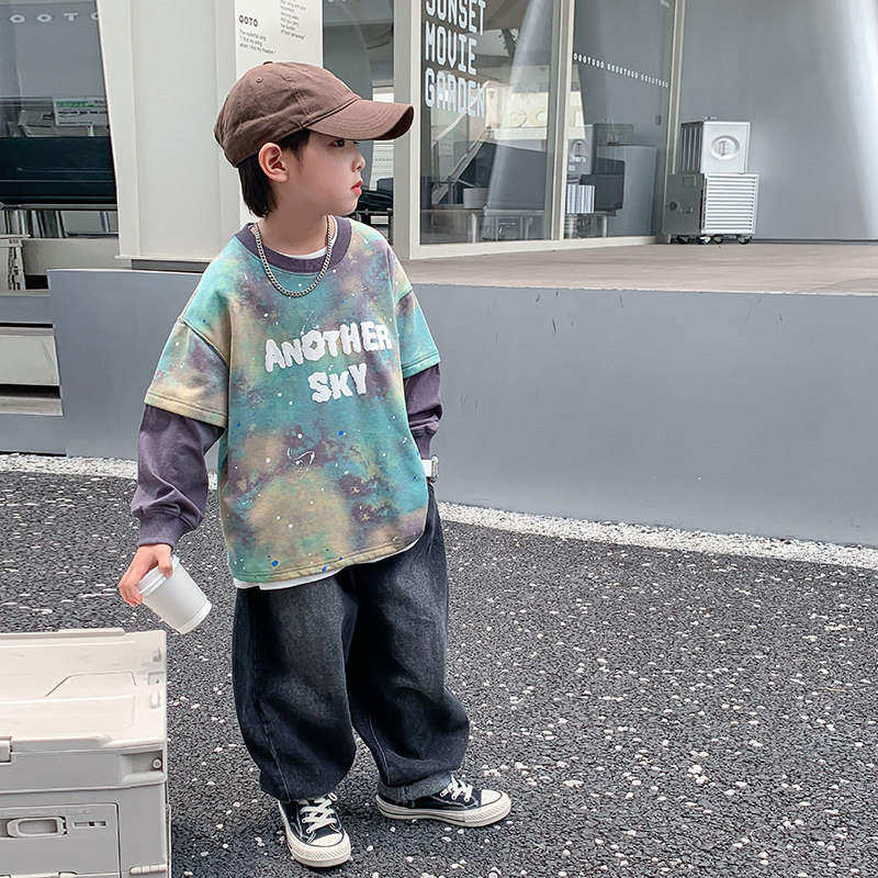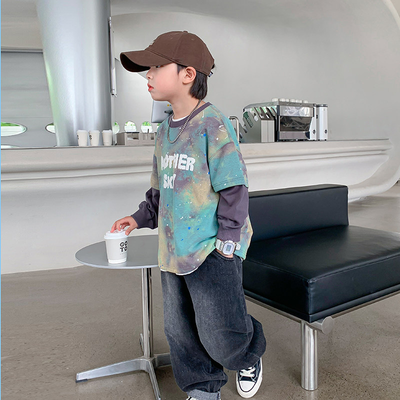 男童春装假两件长袖T恤2026新款中大儿童男孩春秋痞帅宽松上衣潮