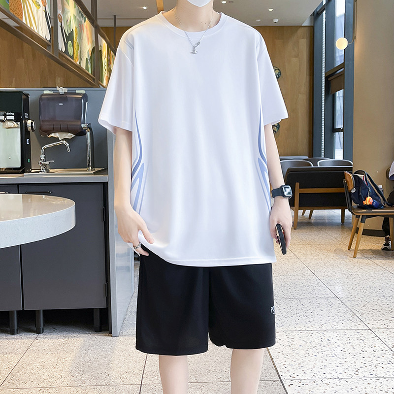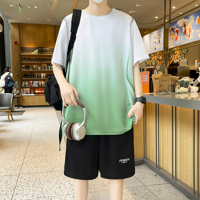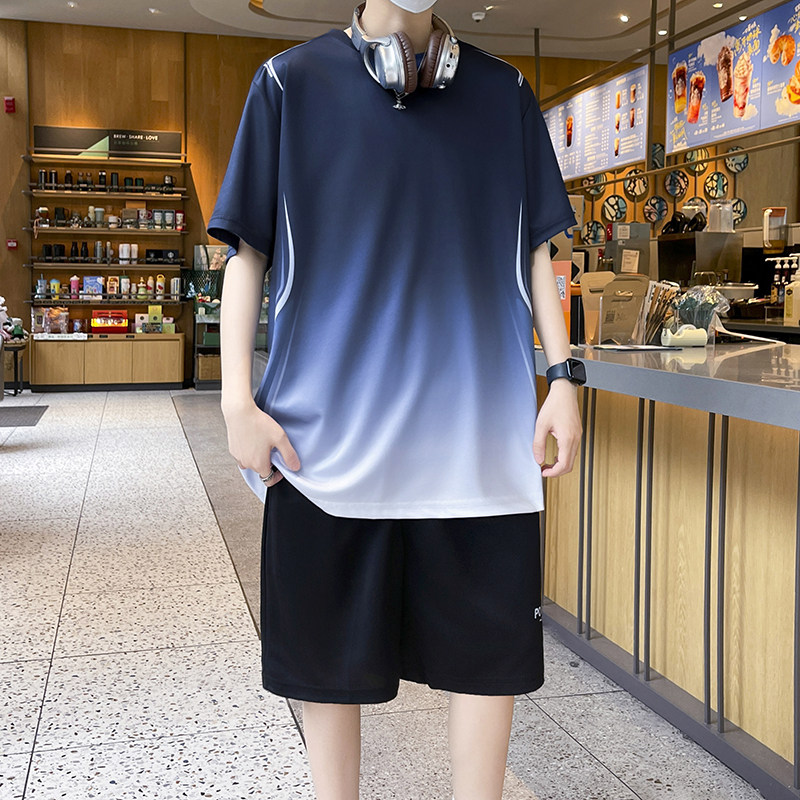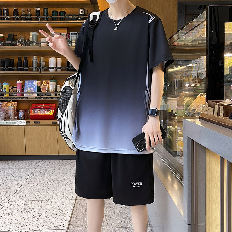 青少年夏季2026新款冰丝短袖t恤男渐变速干男装帅气学生运动套装