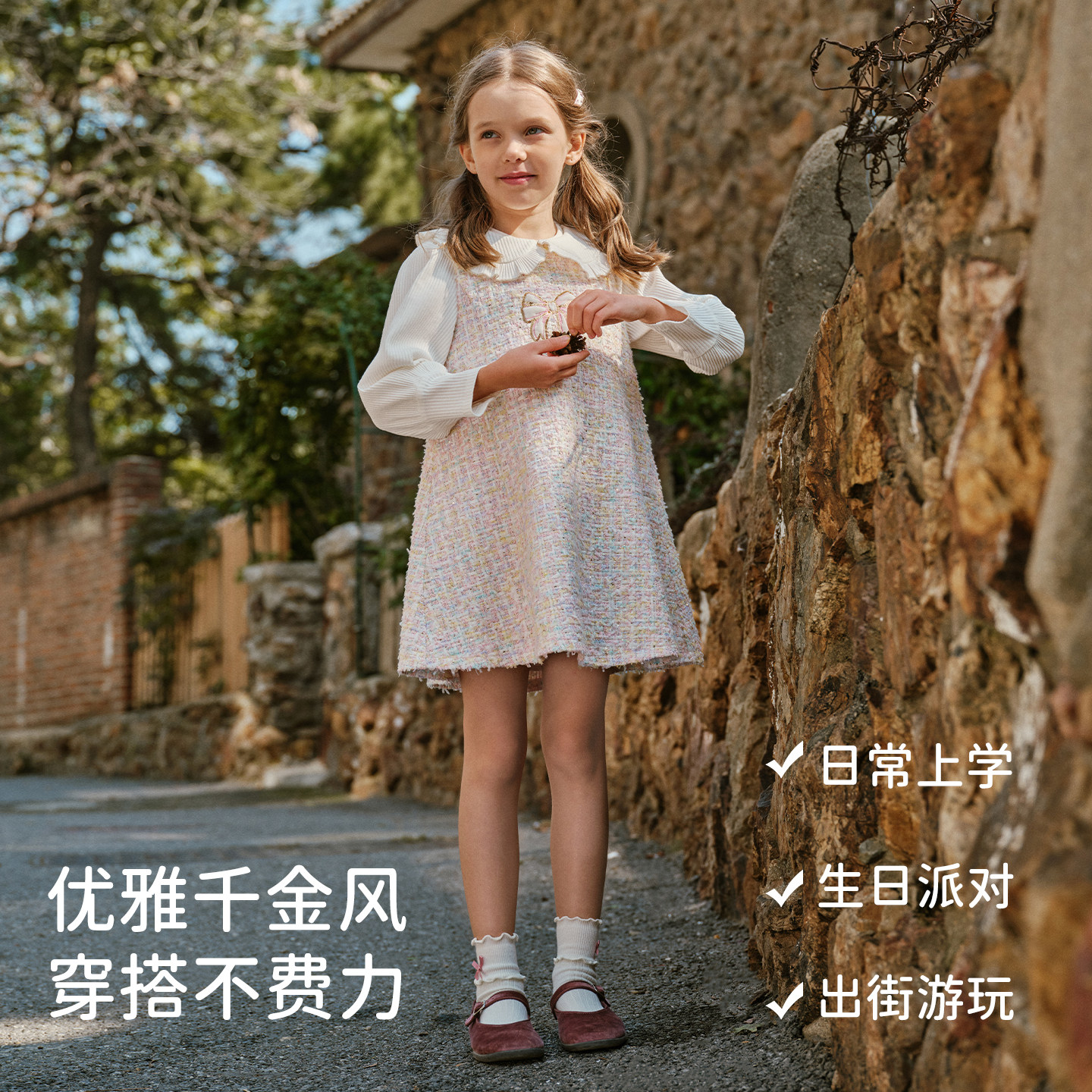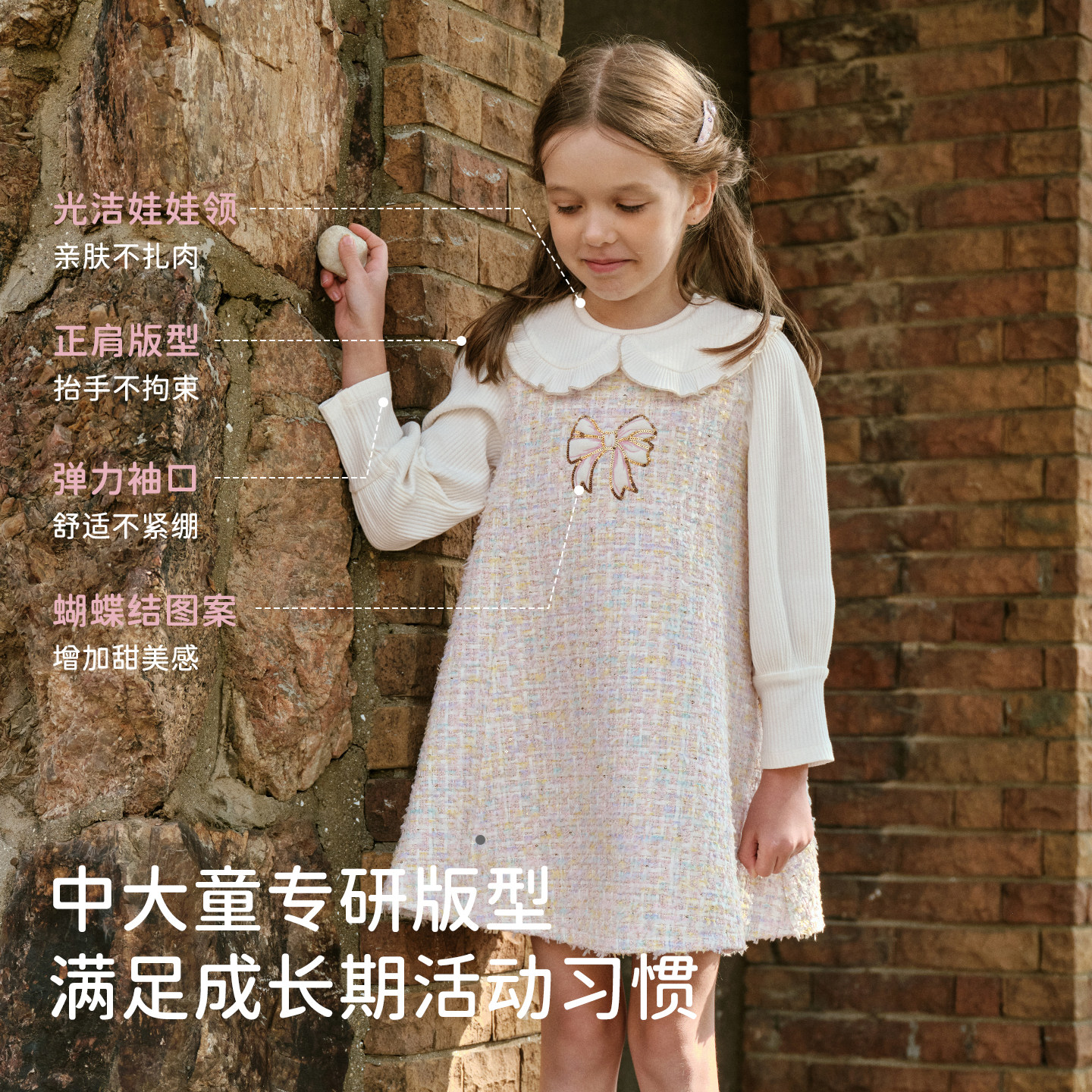 戴维贝拉中大童连衣裙2026春装新女童粉色格小香风裙子长袖假两件