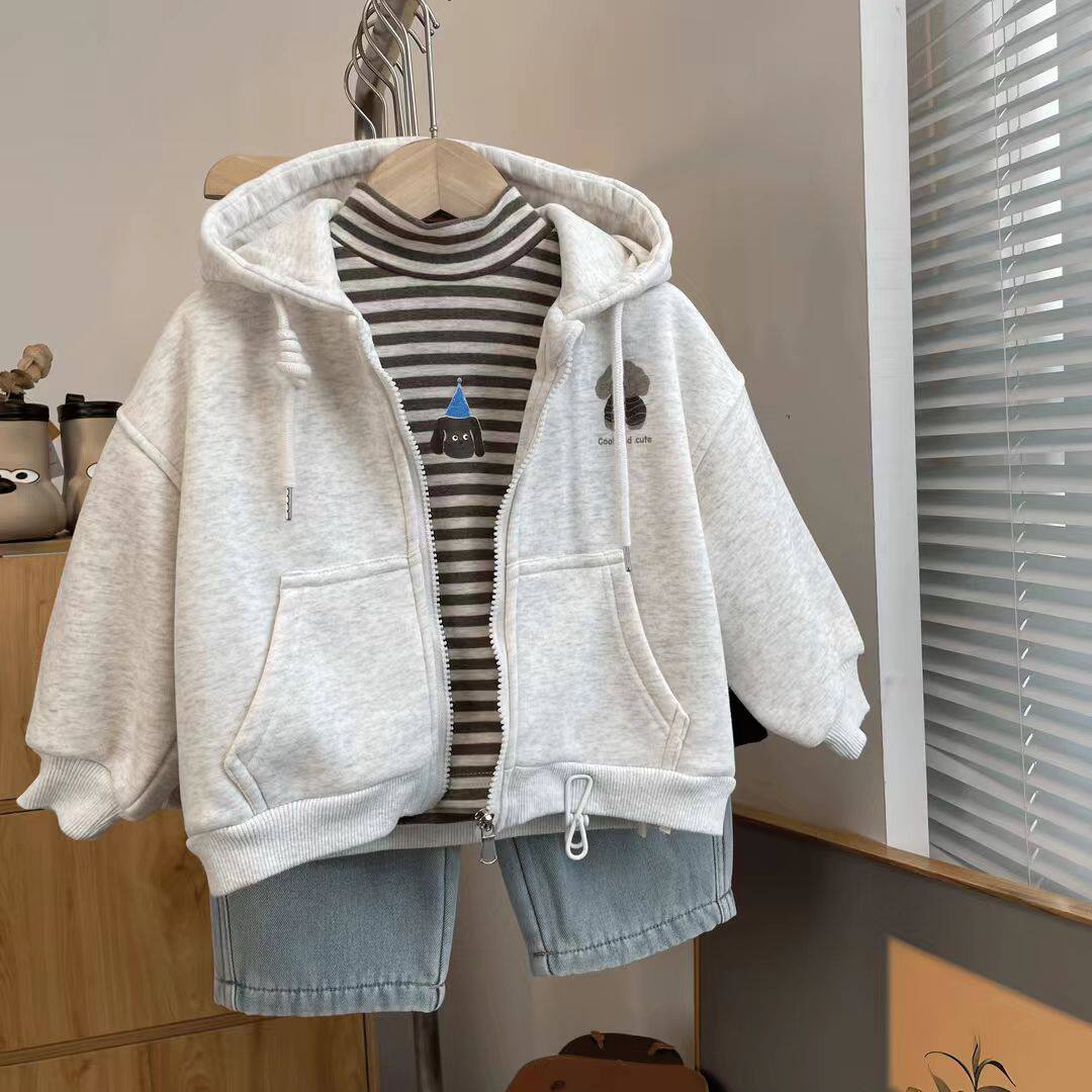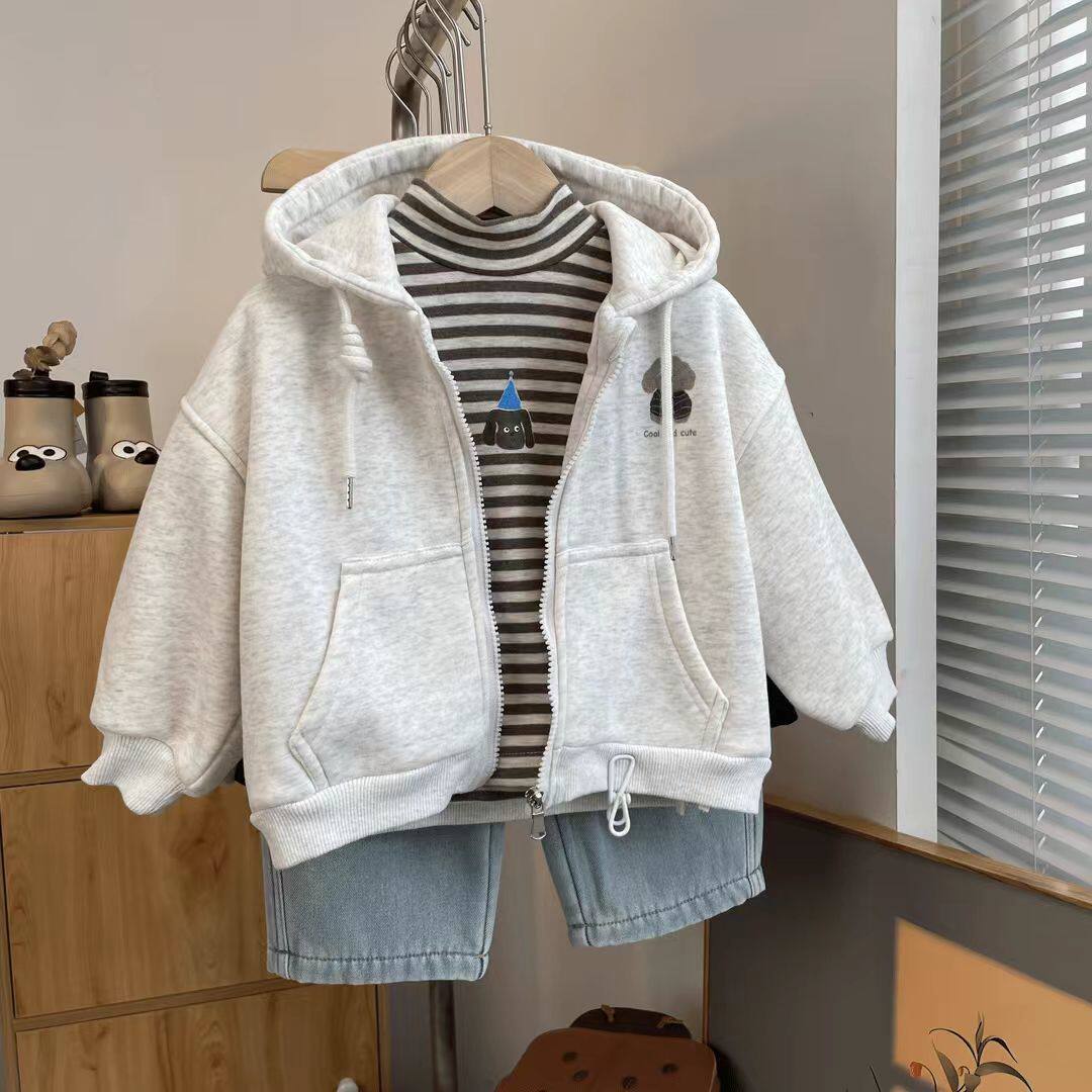 韩版男女童卡通印花加绒连帽外套宝宝儿童百搭开衫拉链卫衣童装潮