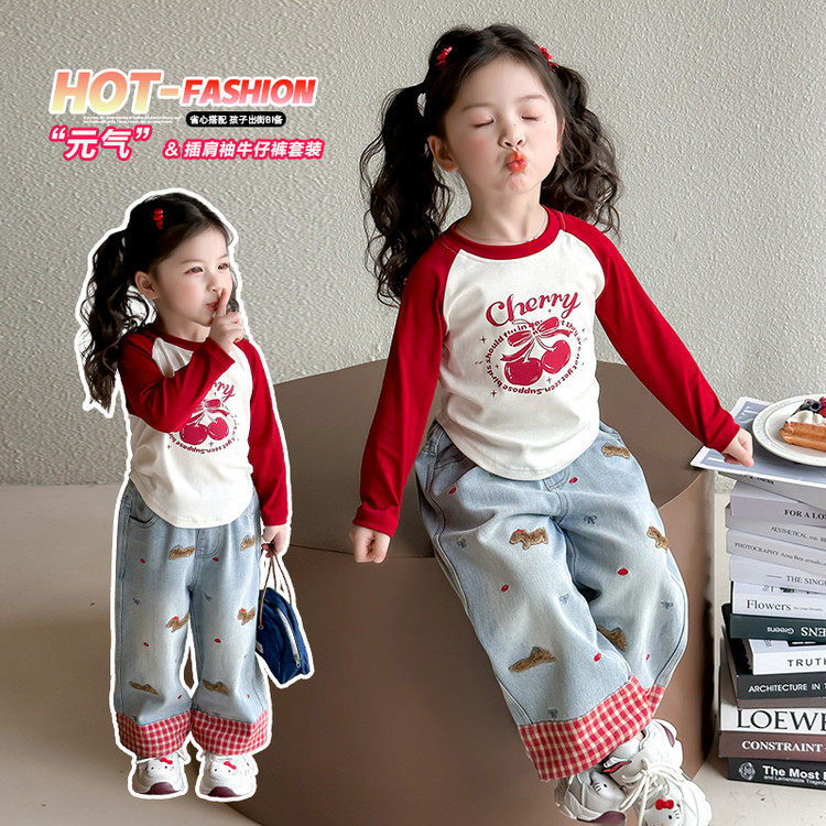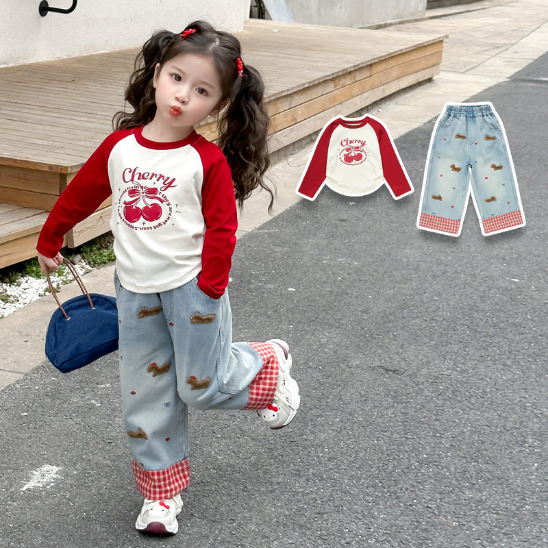 网红炸街童装宝宝春套装女洋气2025新款女童T恤卡通两件套春秋款
