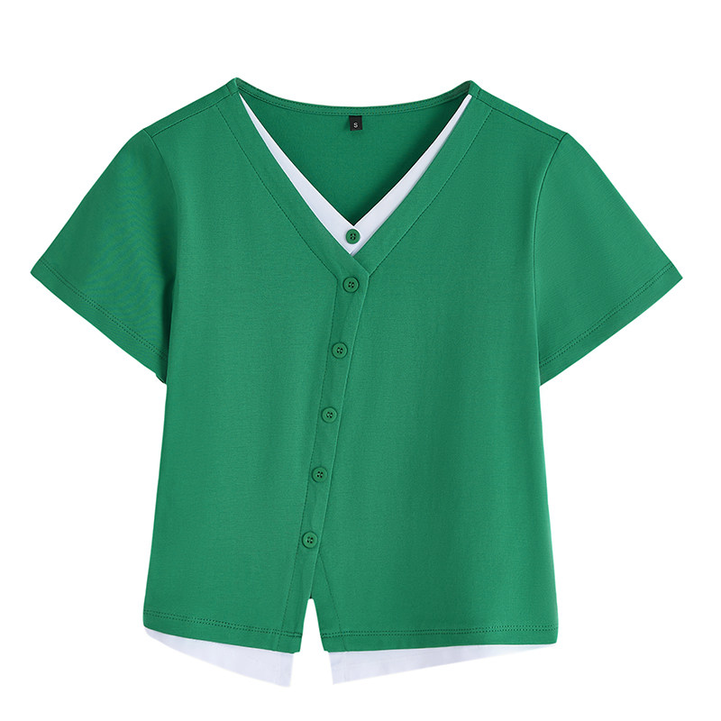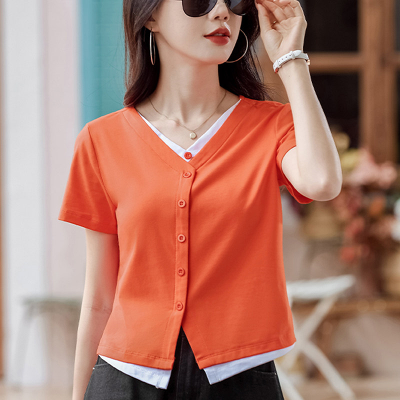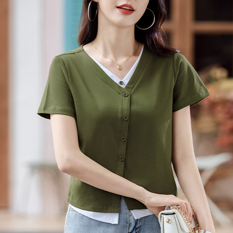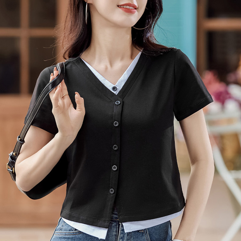 纯棉假两件v领短袖t恤女夏季2026新款时尚洋气小个子气质短款上衣