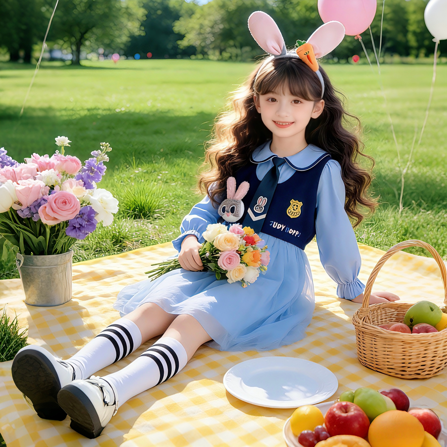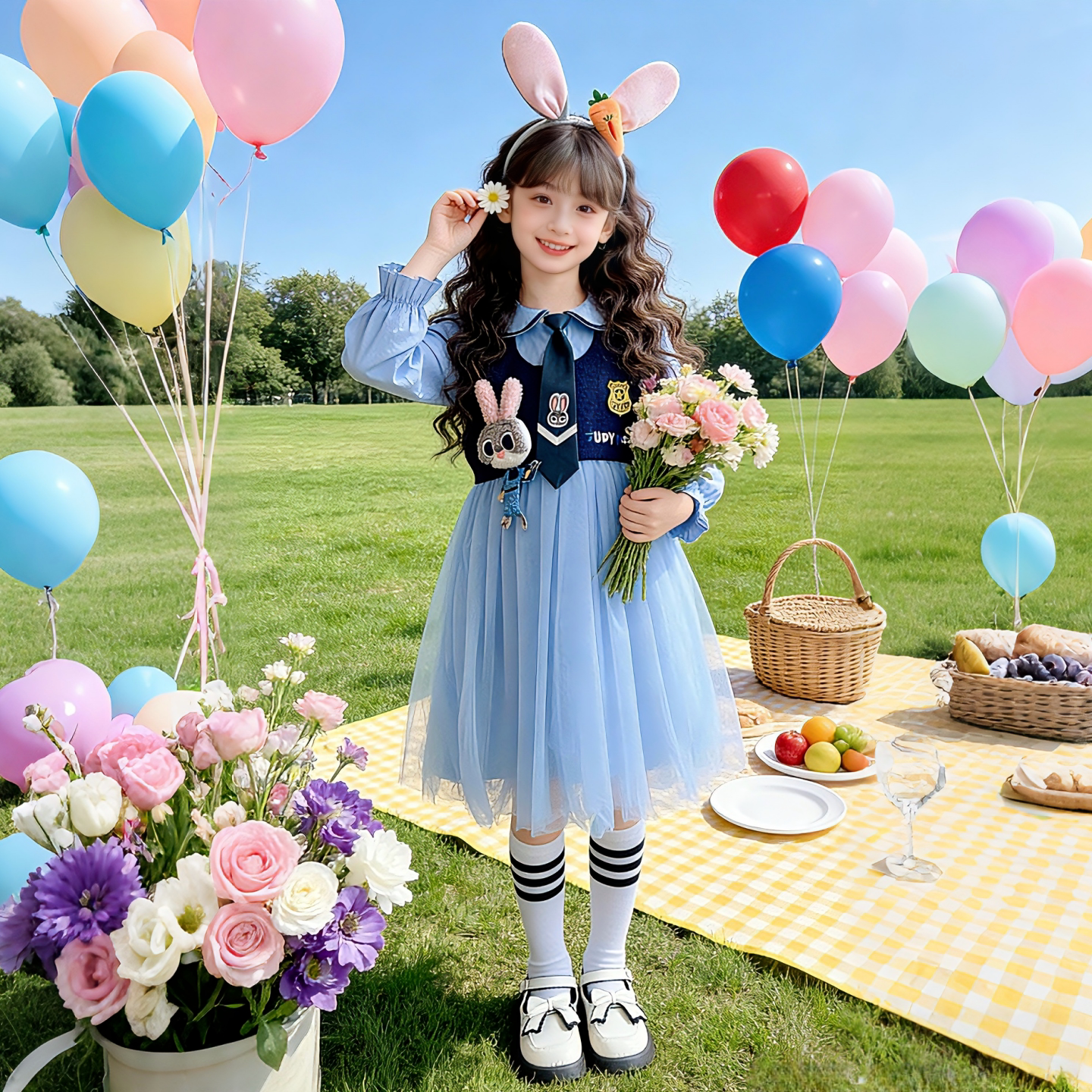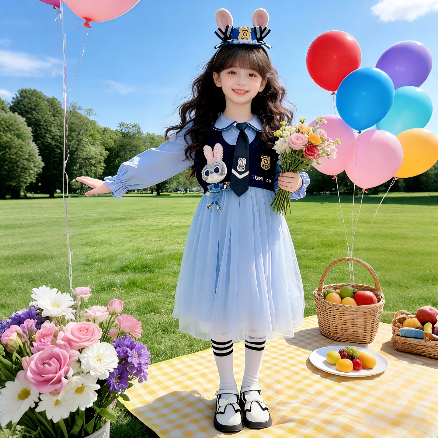 女童春秋新款连衣裙卡通兔子警官早春儿童洋气可爱春装中大童裙子