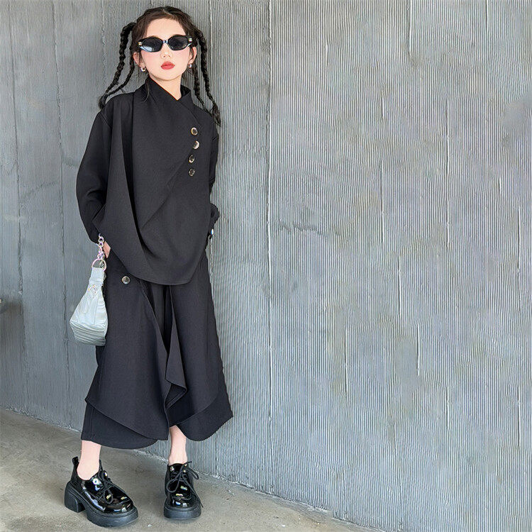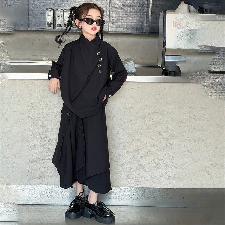 女童春装套装中大童休闲不规则长袖衬衫2024新款韩版港风两件套潮