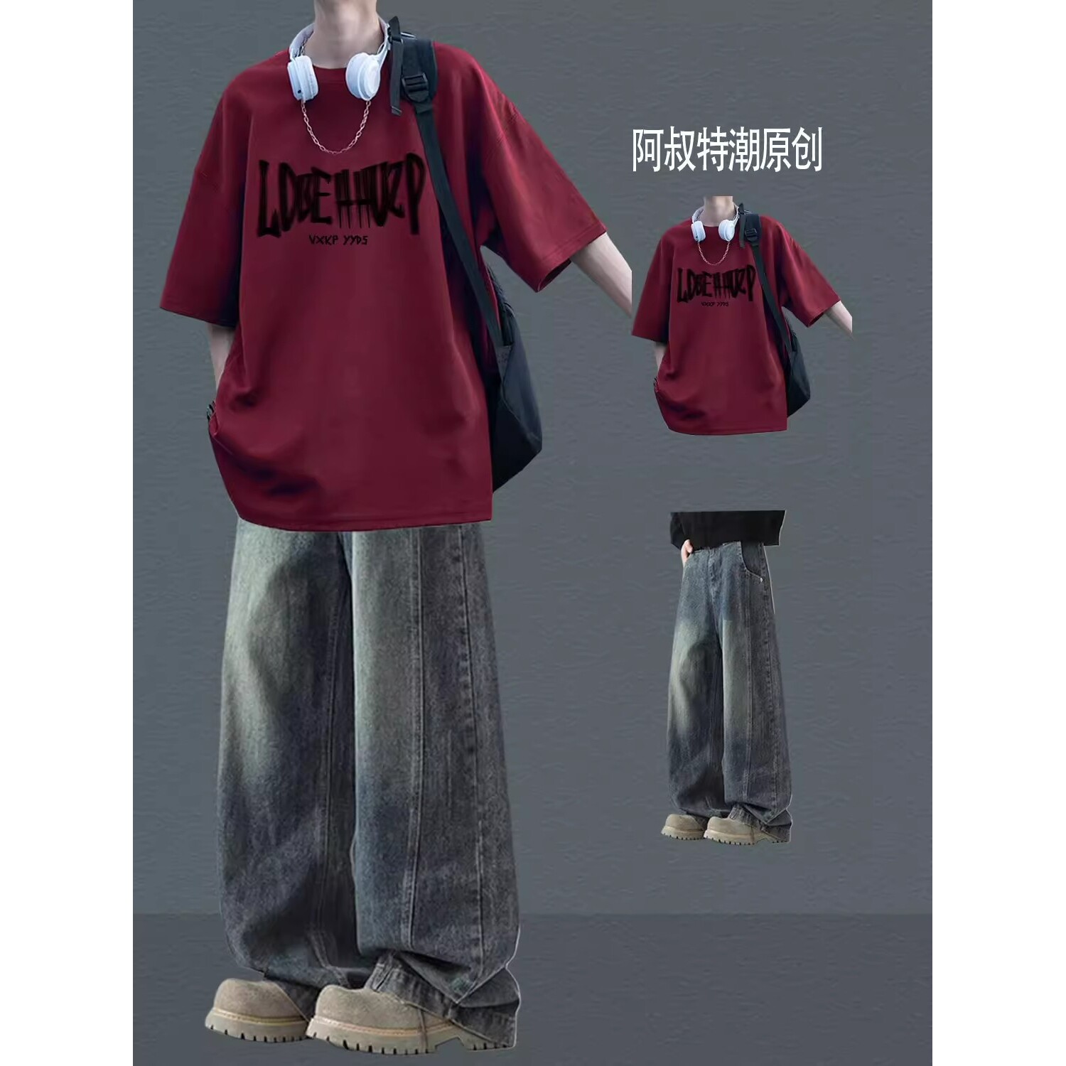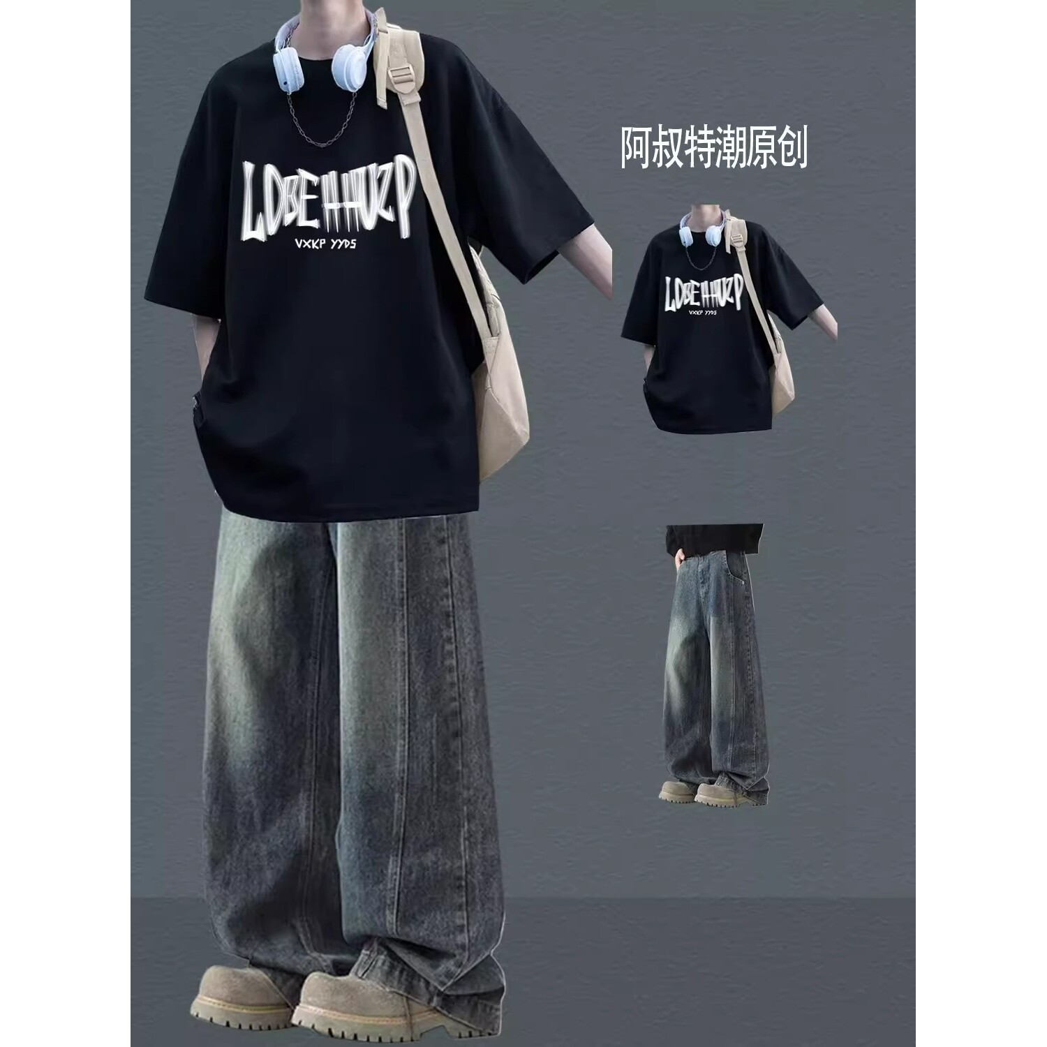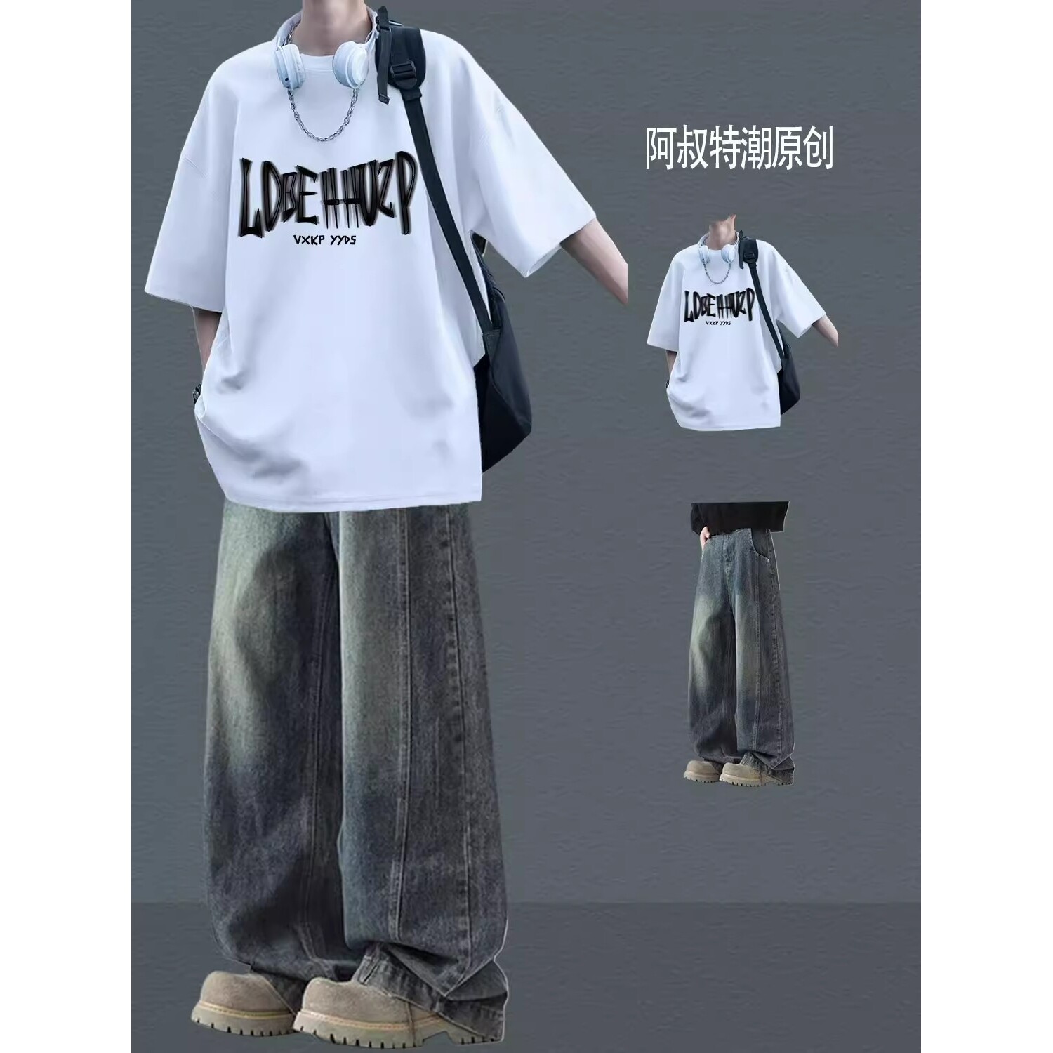 美式风纯棉短袖T恤男生夏季2026新款青少年男装帅气学生潮流套装