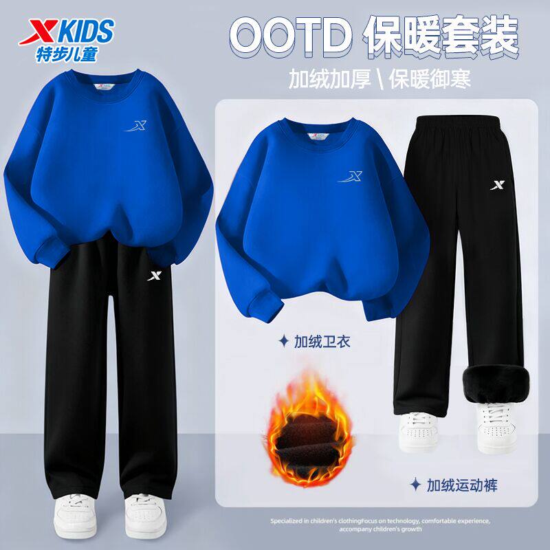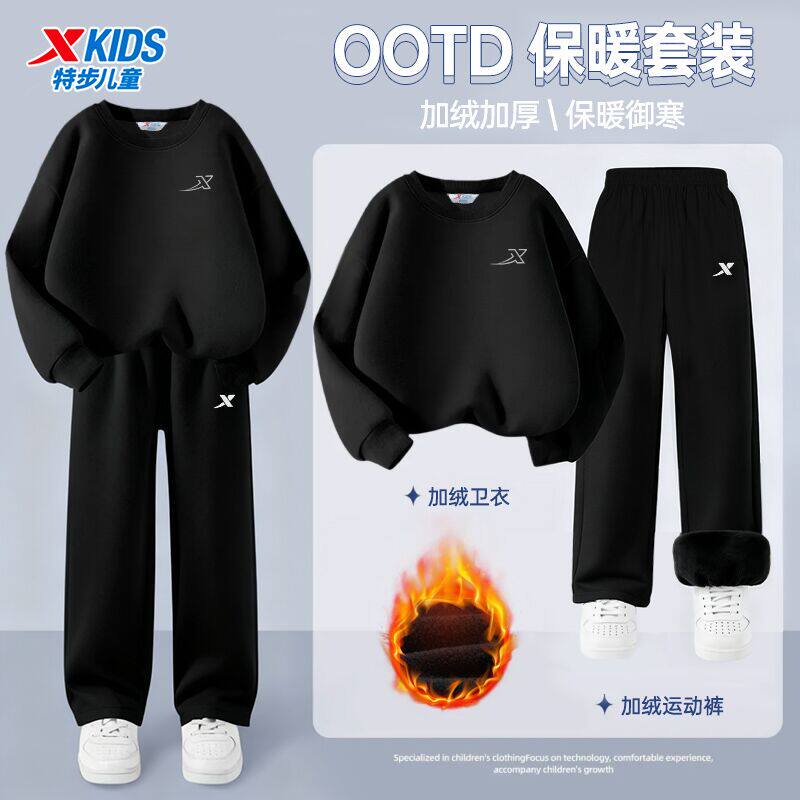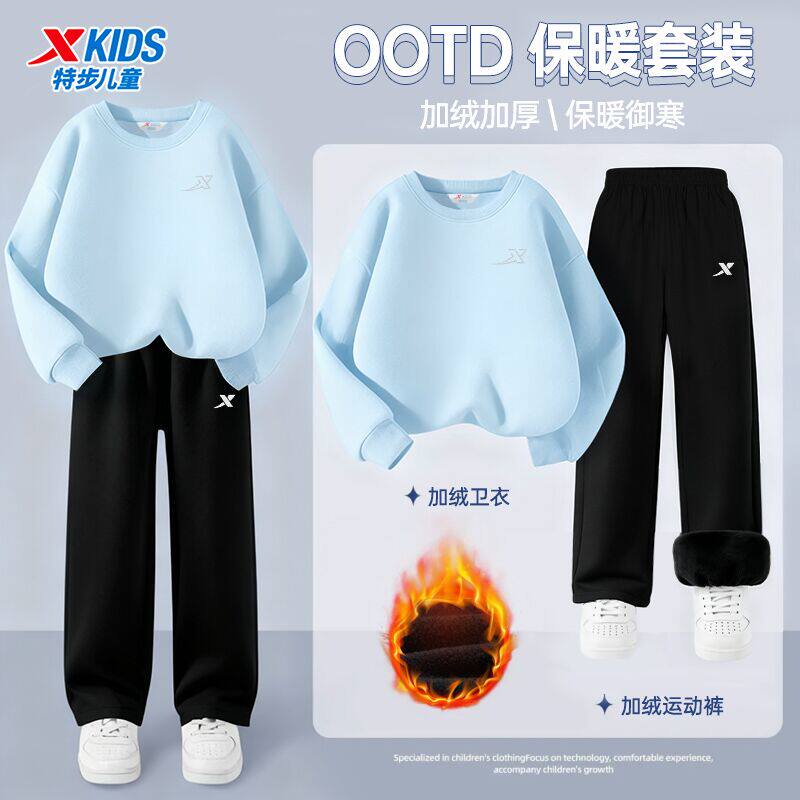 特步青少年加绒卫衣套装男童冬季两件套正品小学生户外休闲运动服