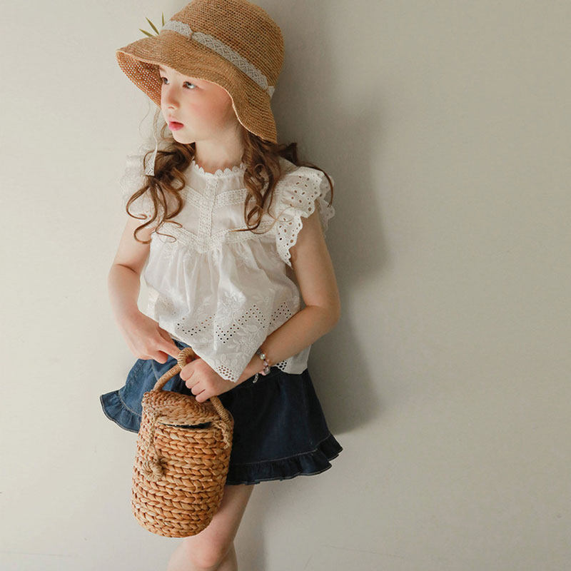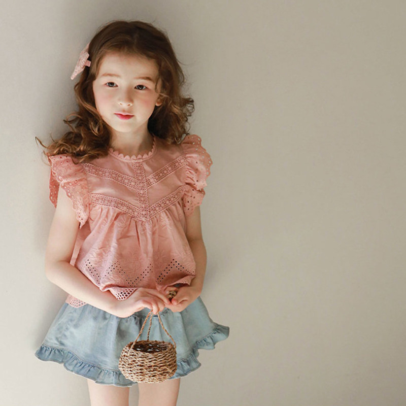 女童上衣短袖棉夏装韩版童装洋气时髦镂空花边儿童女宝宝公主体恤
