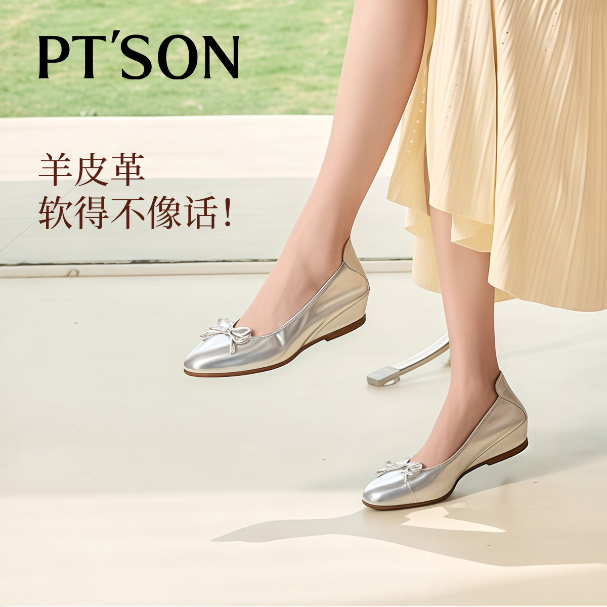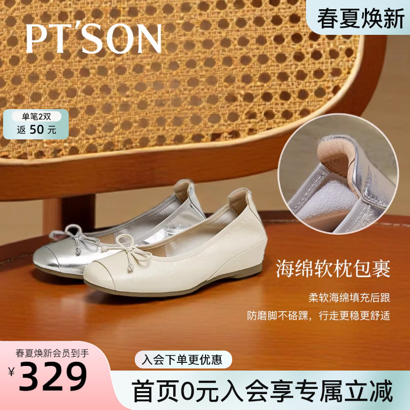 商场同款百田森超软晚晚鞋春款女鞋羊皮银色单鞋芭蕾风鞋子