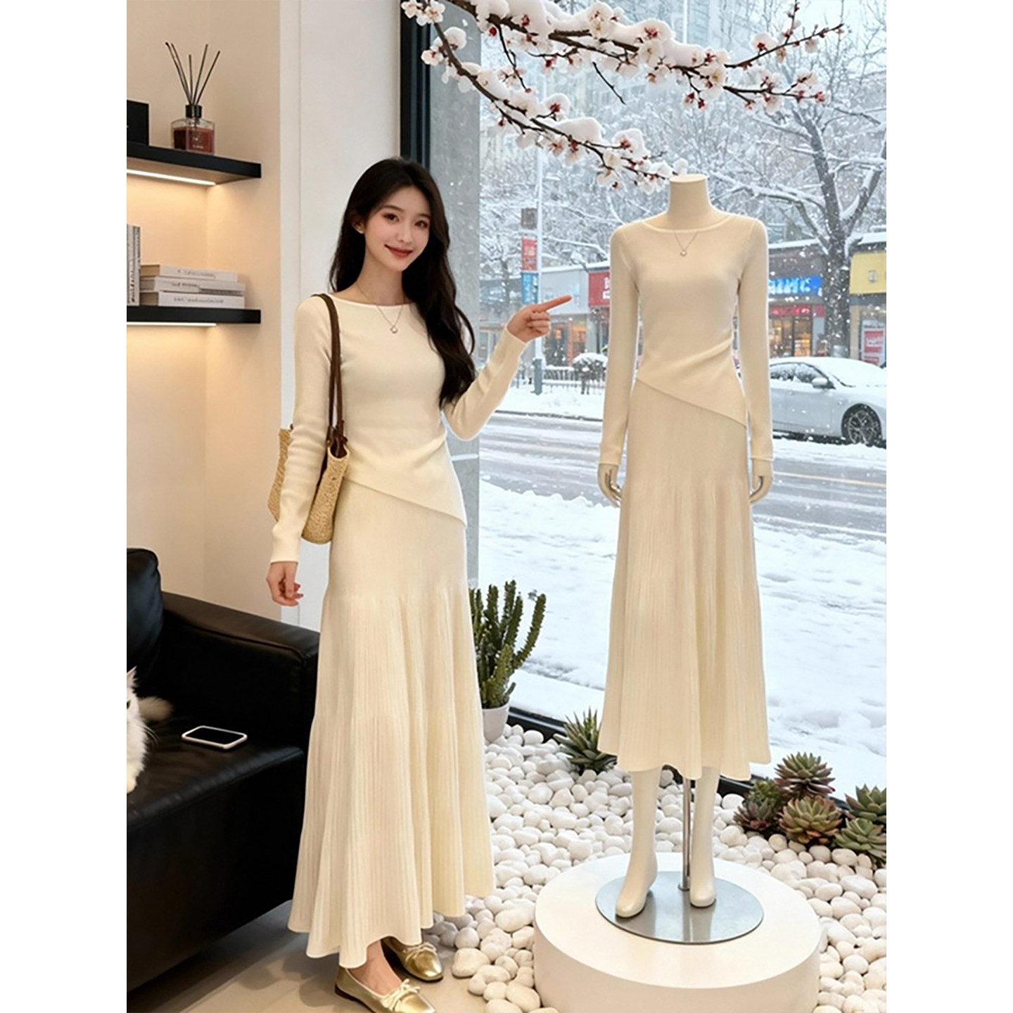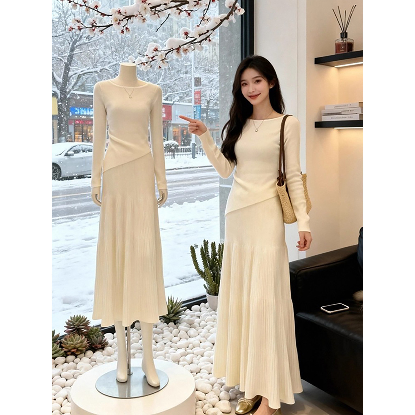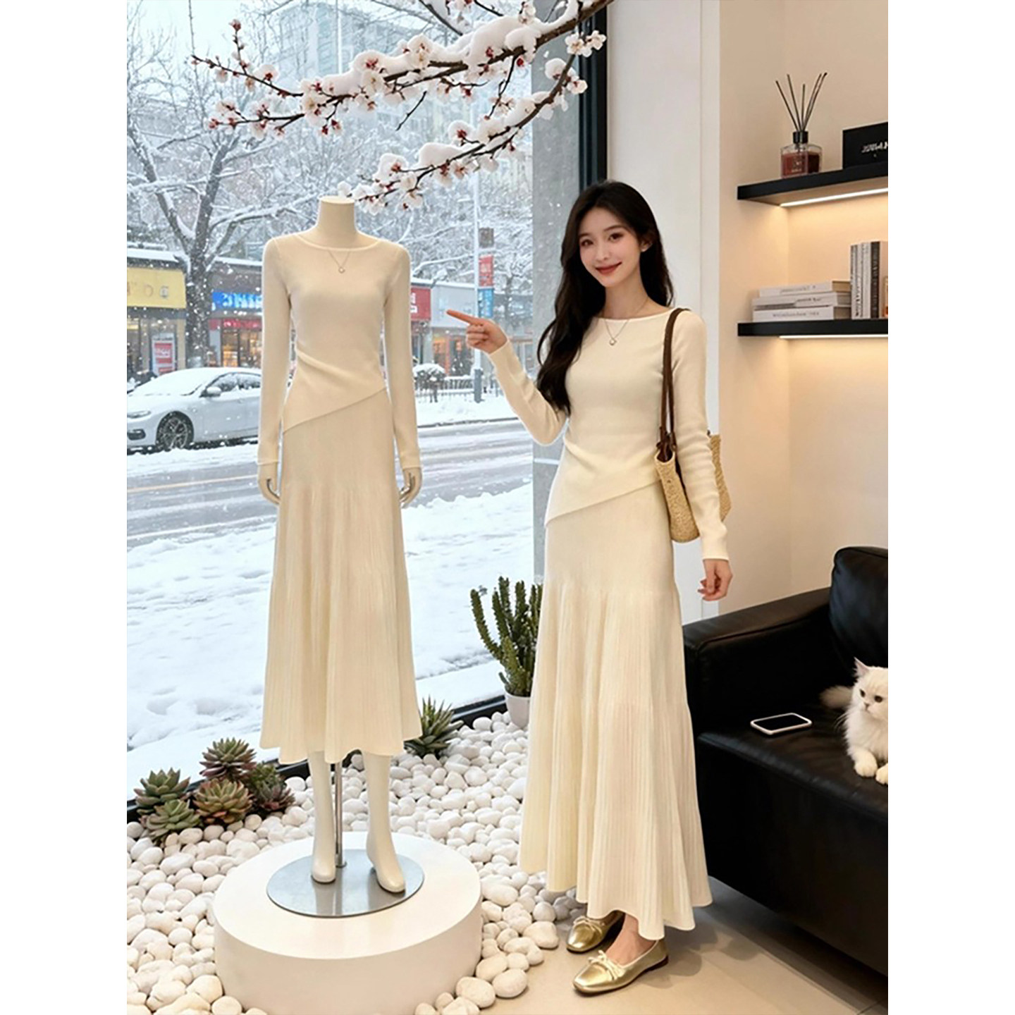 气质白色长袖露背连衣裙子女冬季2025新款高级感收腰显瘦打底长裙