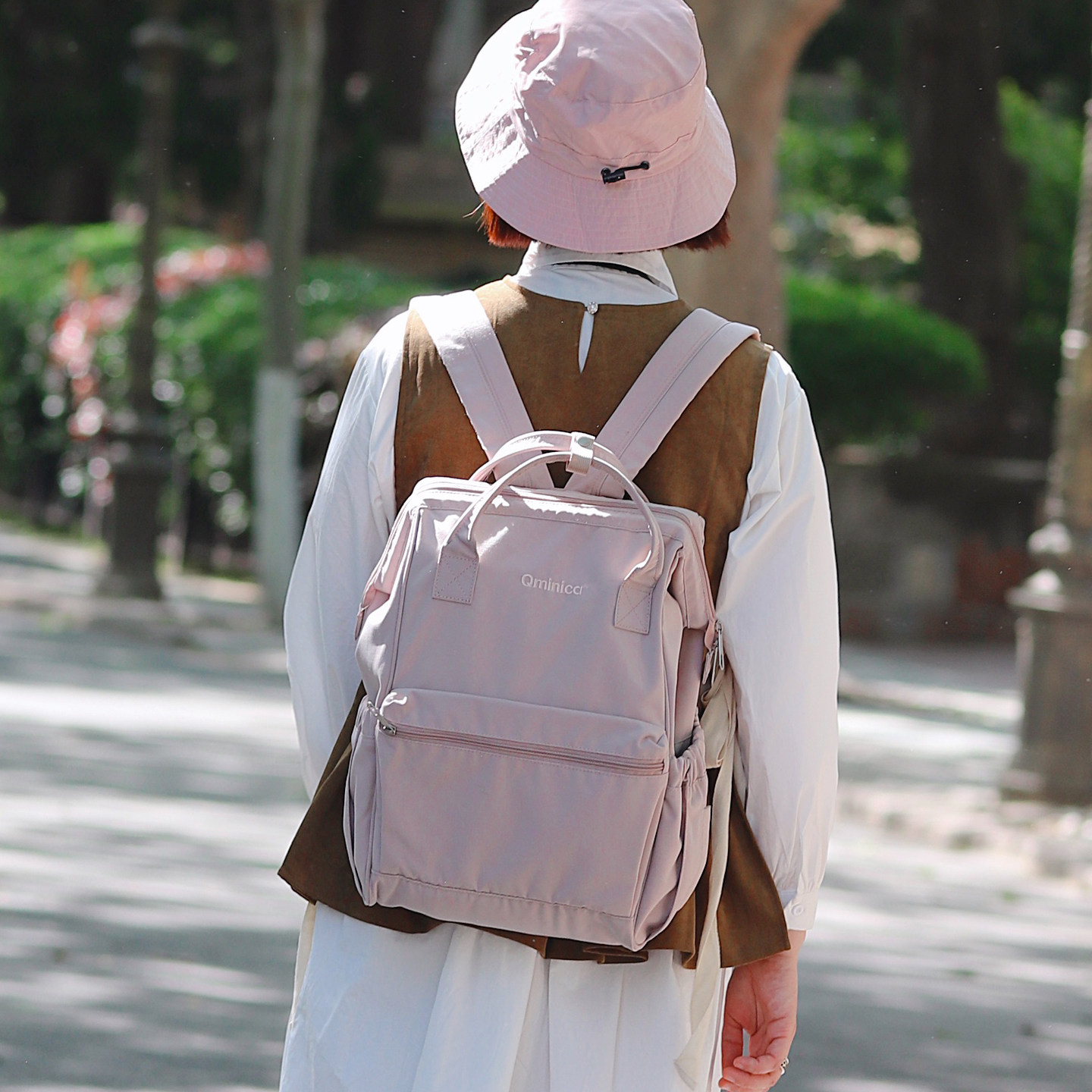 Qminica休闲双肩包大容量书包简约户外短途旅行包女电脑包多功能