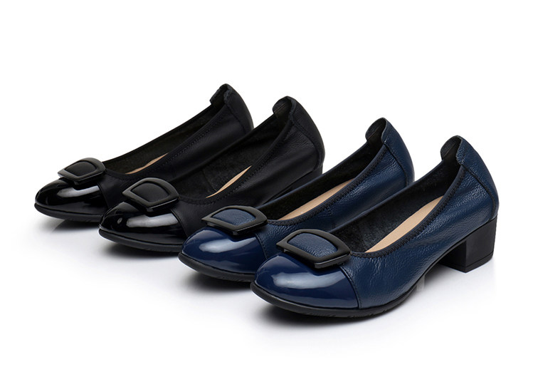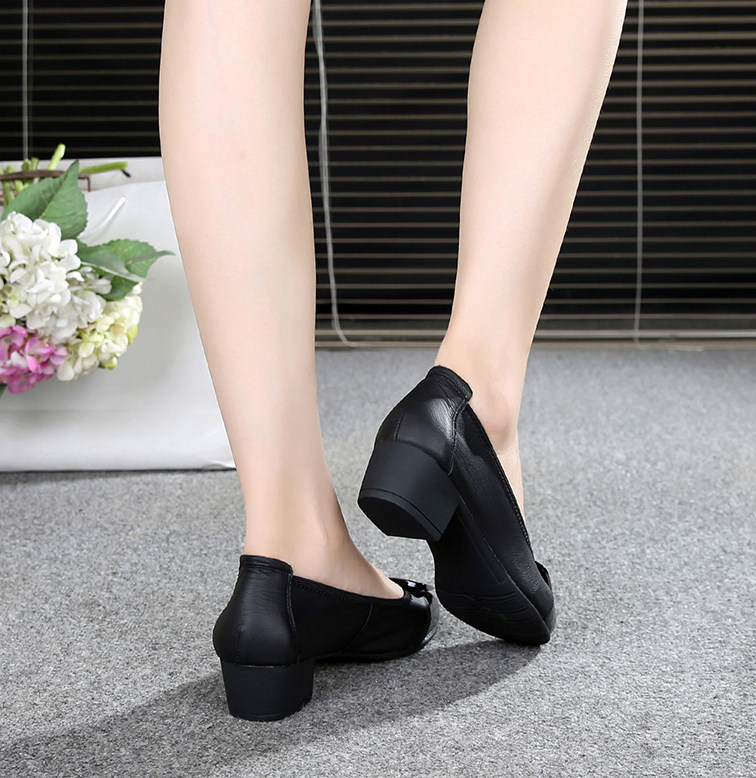 上海花牌真皮女鞋春秋单鞋浅口圆头舒适中跟单鞋粗跟一脚蹬妈妈鞋