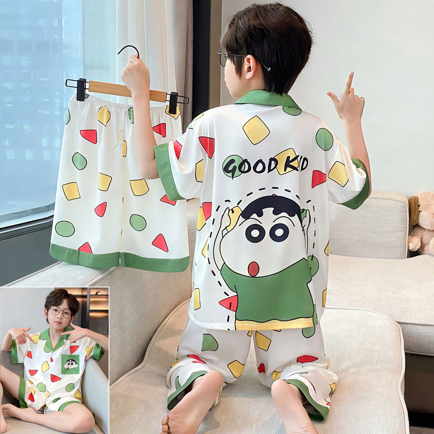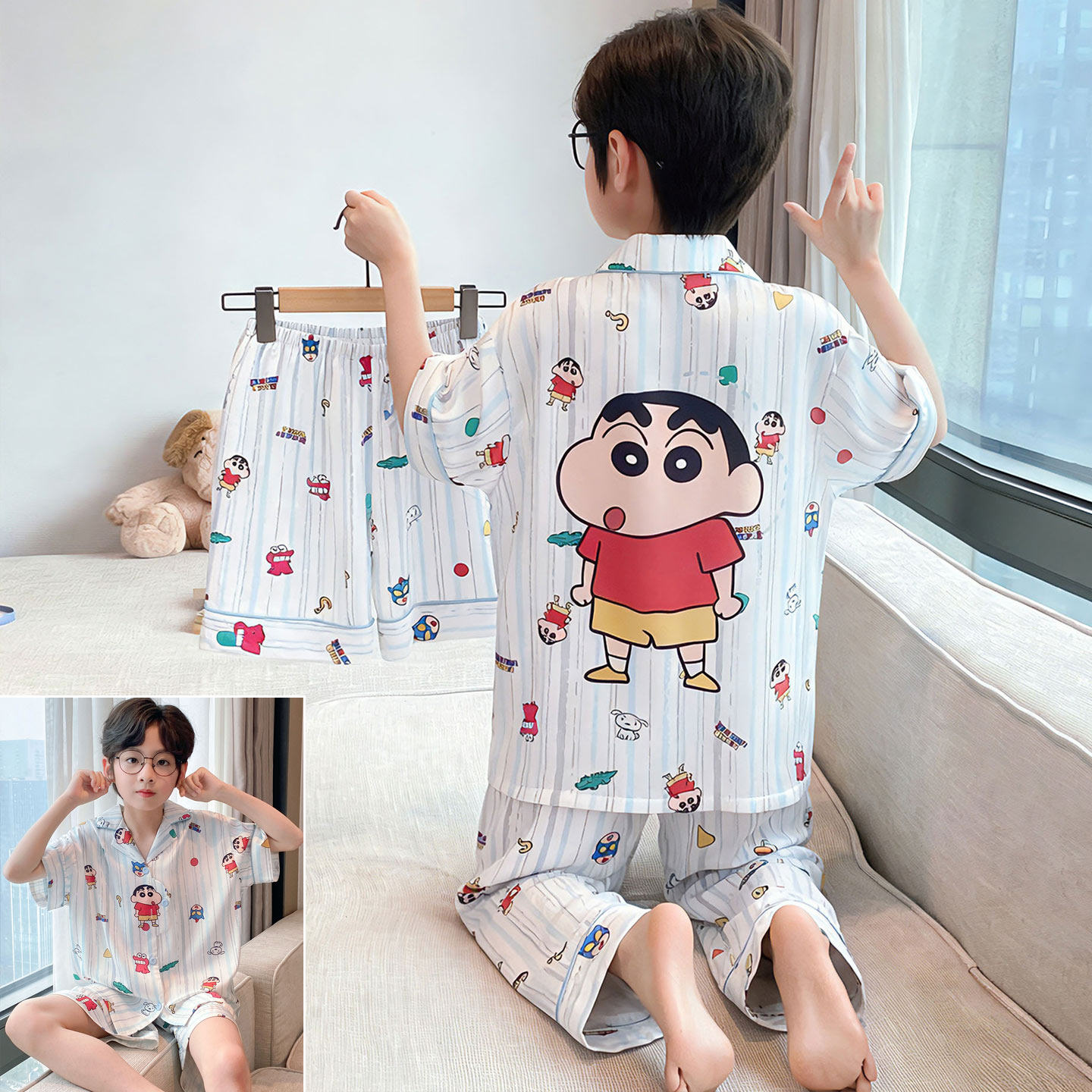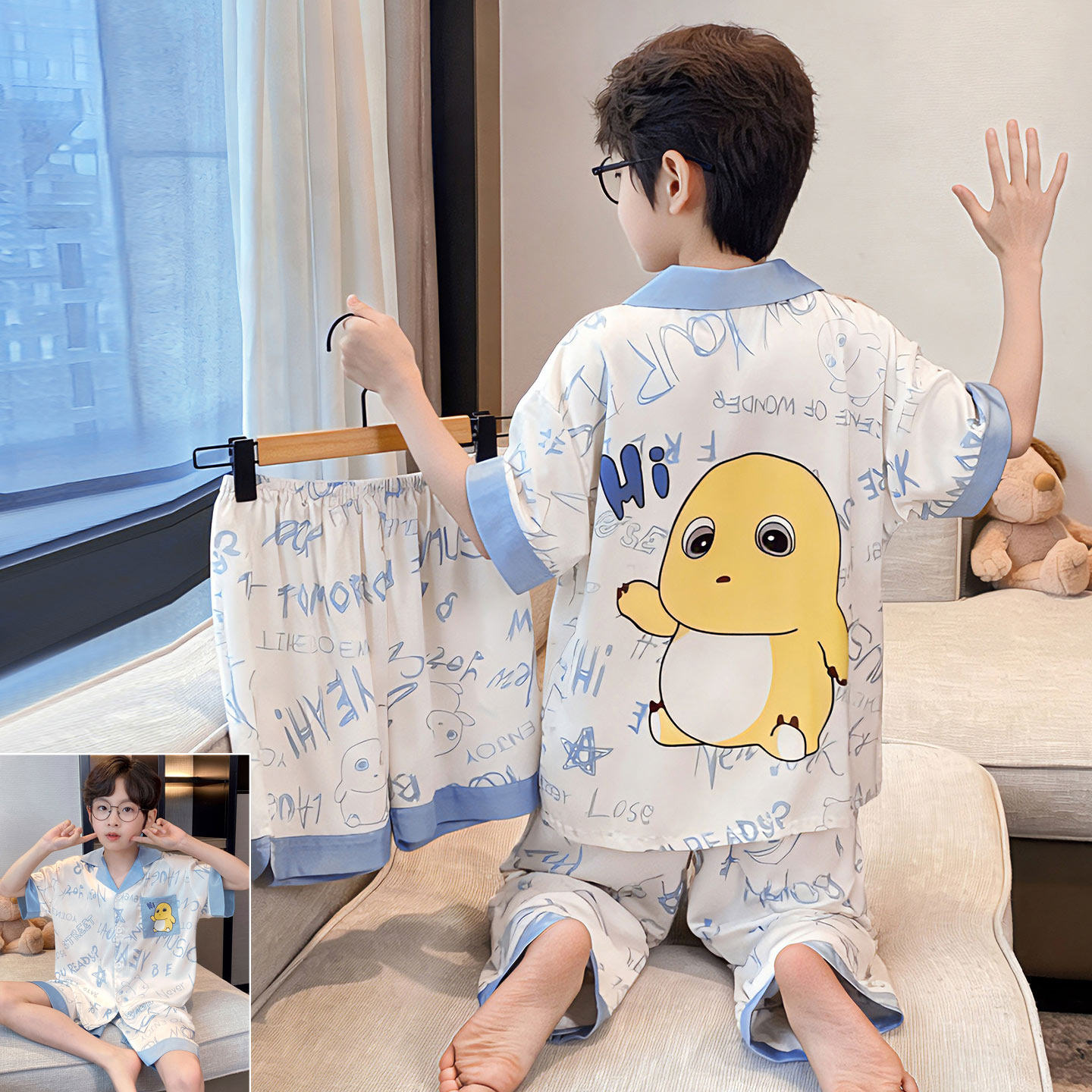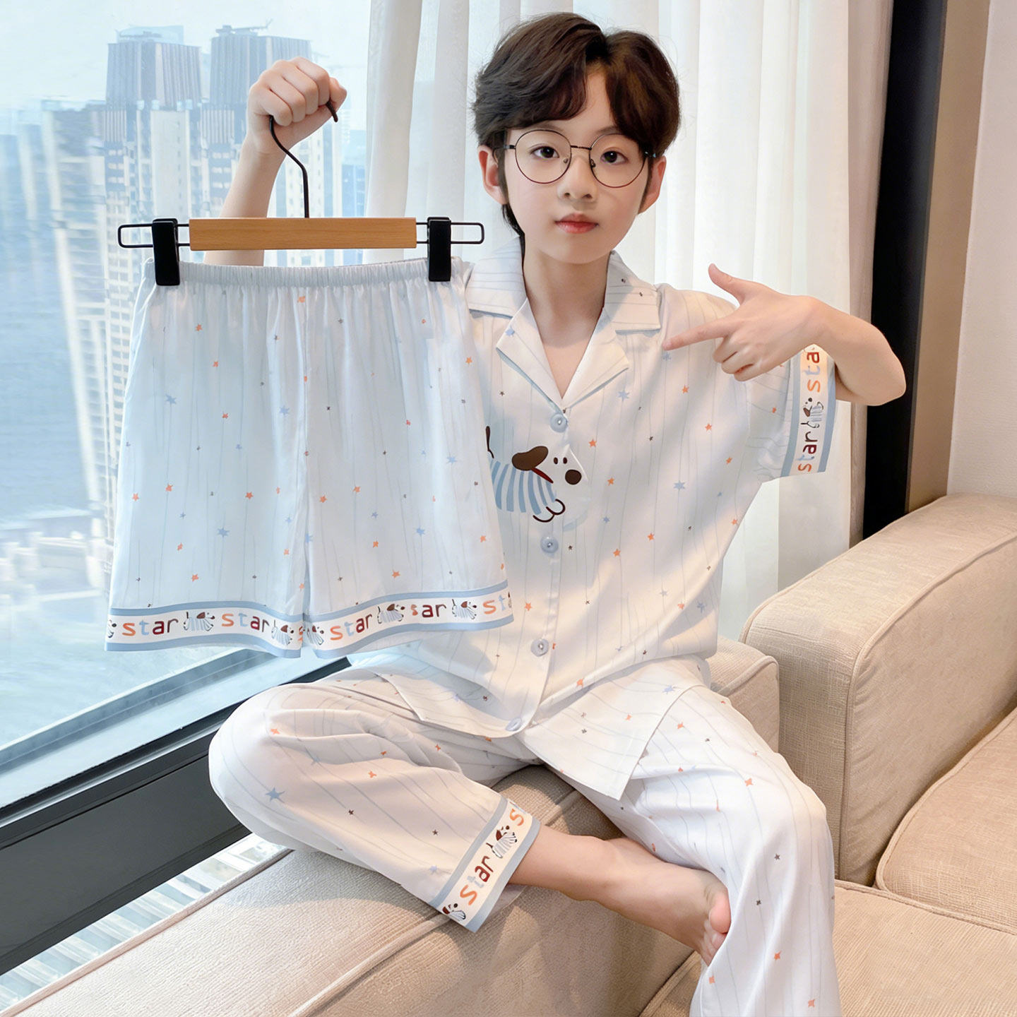 男童睡衣冰丝短袖薄款夏季中大童卡通儿童宝宝青少年三件套家居服