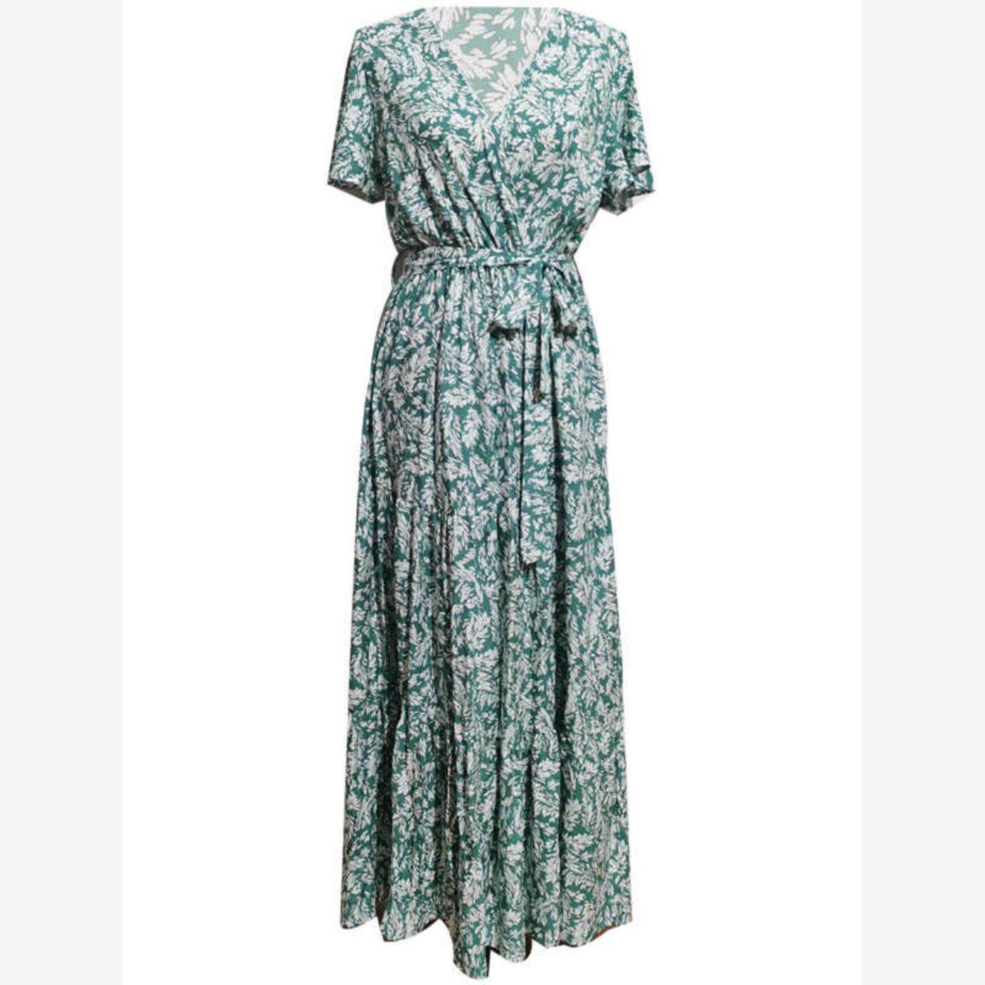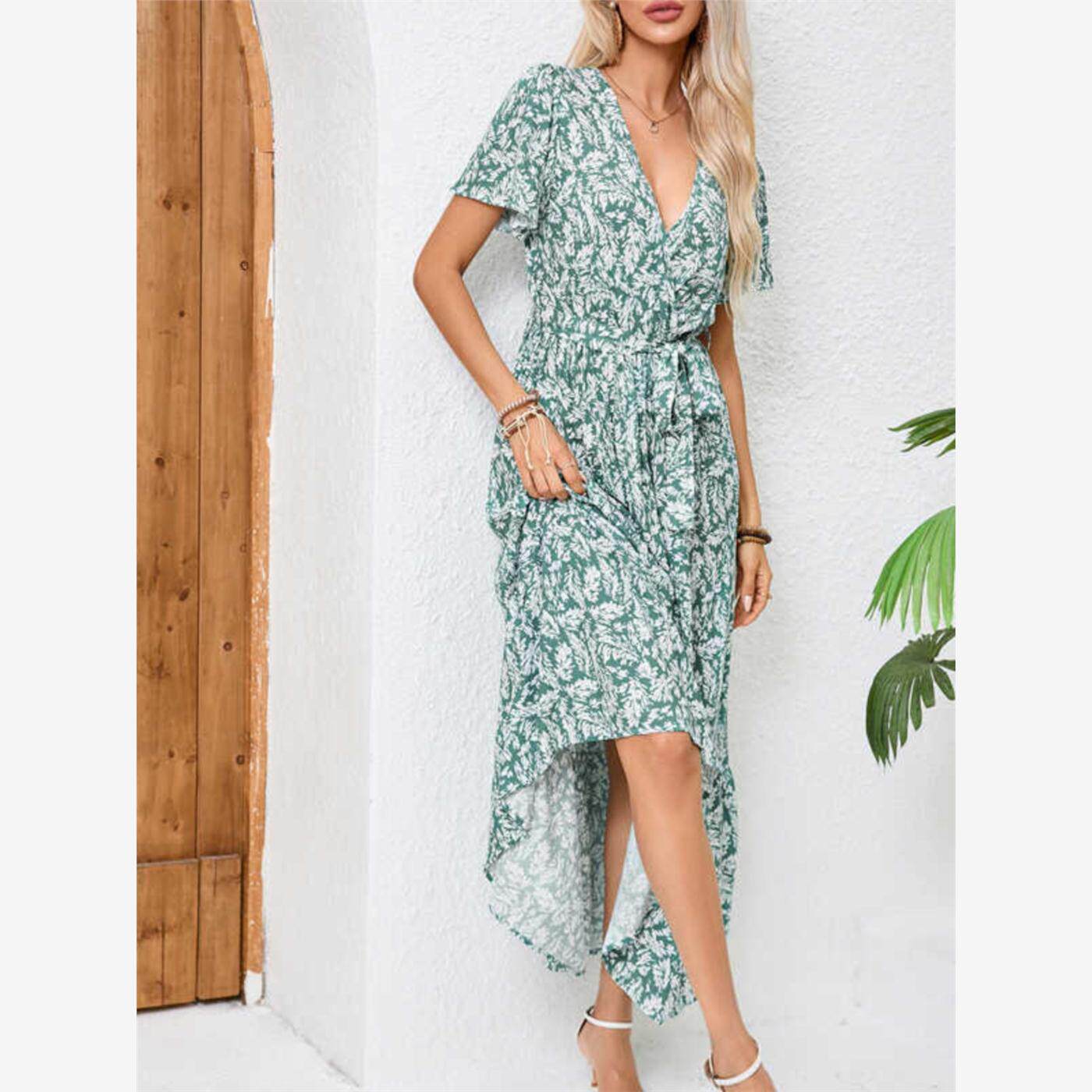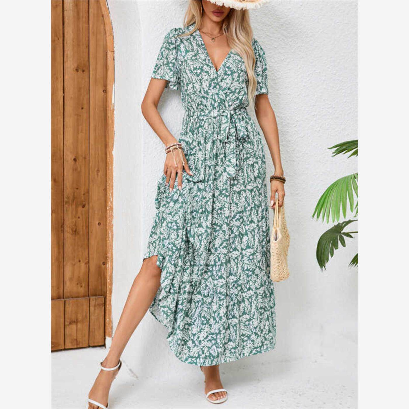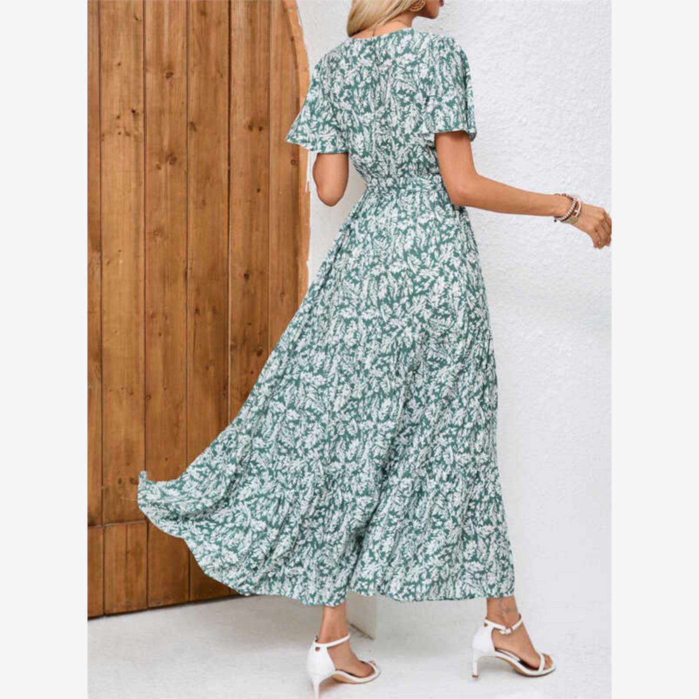 欧美风夏女波西米亚度假风碎花裙子棉绸短袖连衣裙收腰沙滩长裙