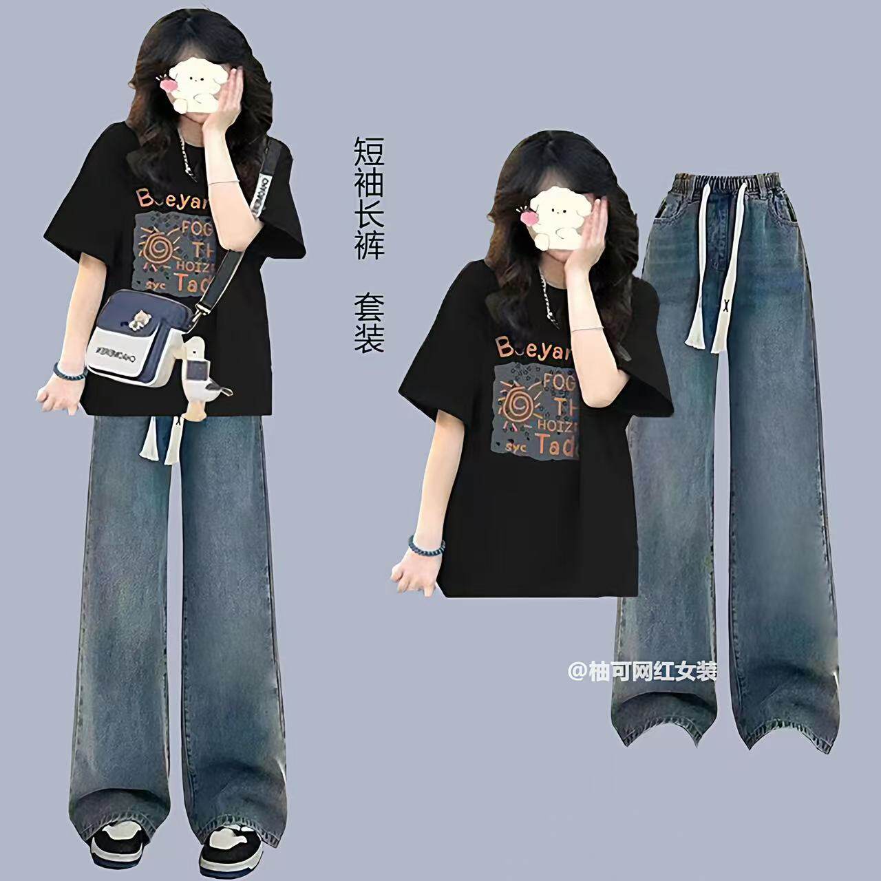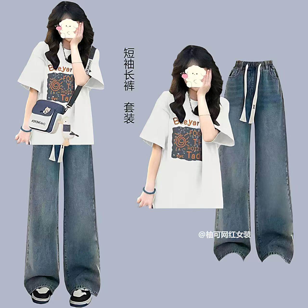 初中生夏季运动套装女大童宽松短袖穿搭一整套高中生牛仔裤两件套