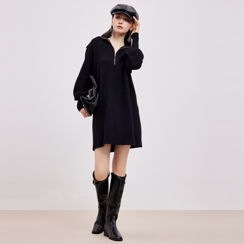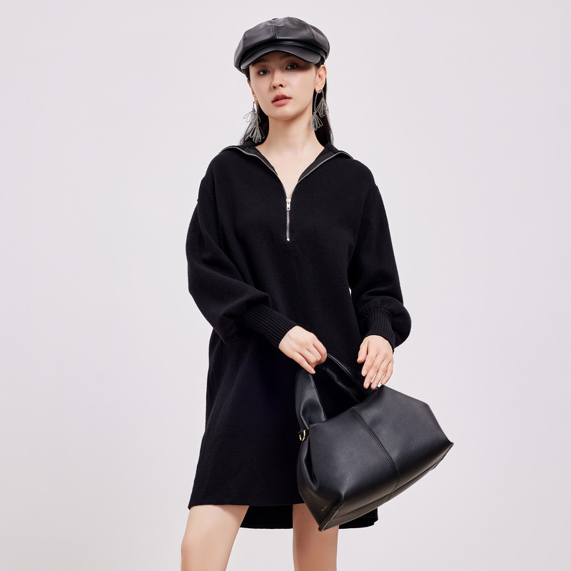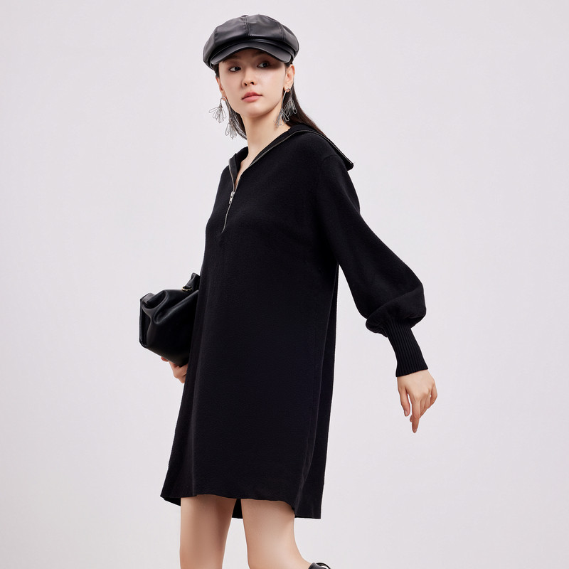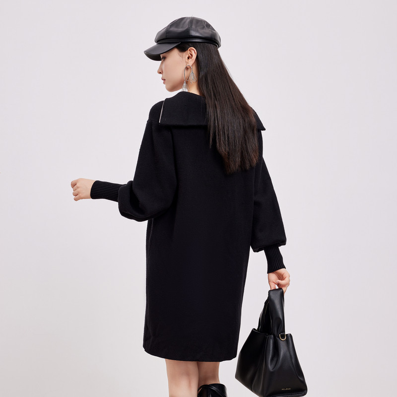 鲁思蒂黑色针织长袖连衣裙2026新款女春秋气质宽松显瘦中长款裙子