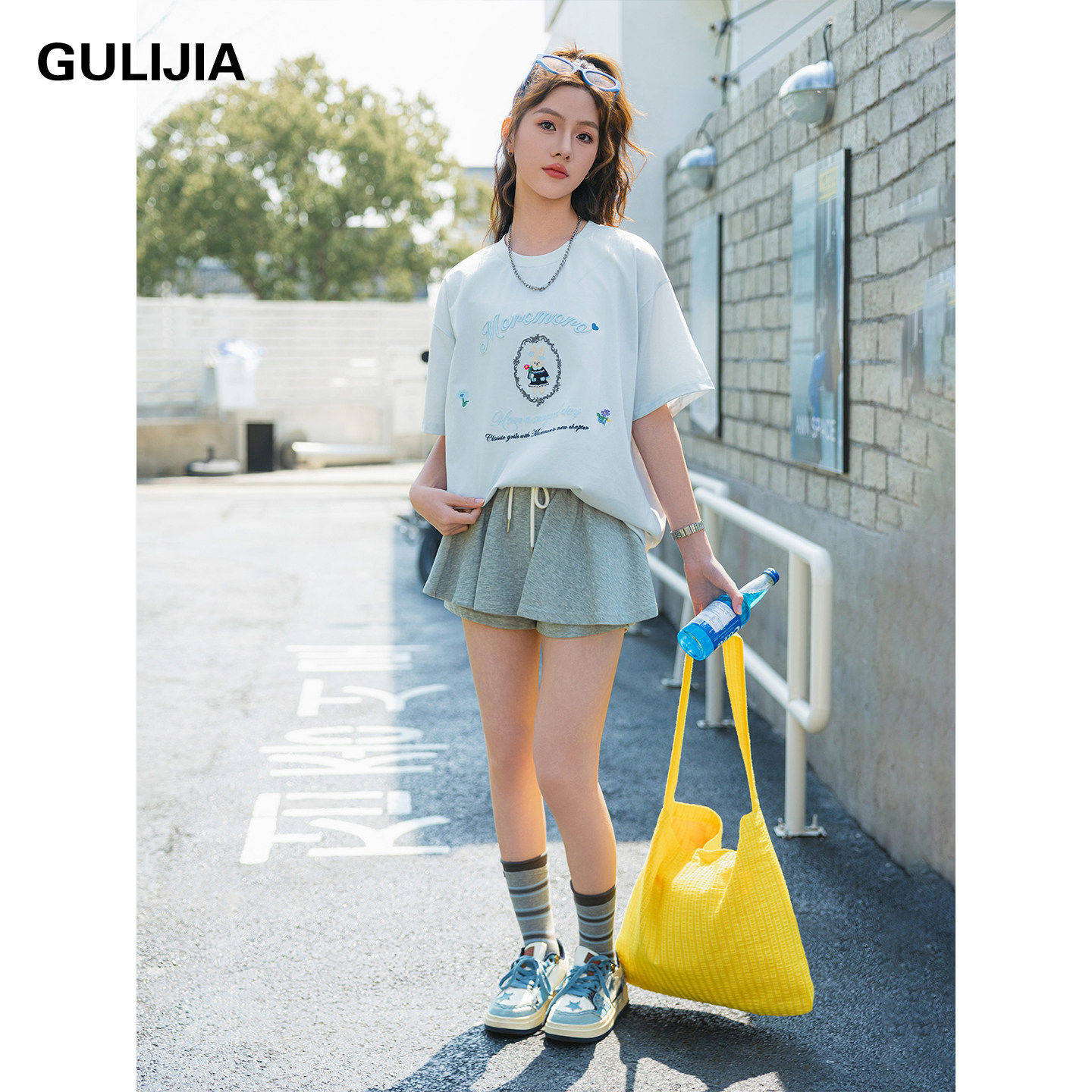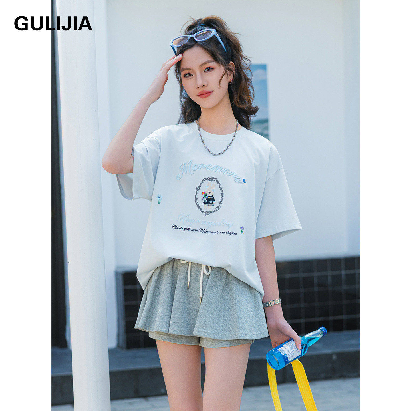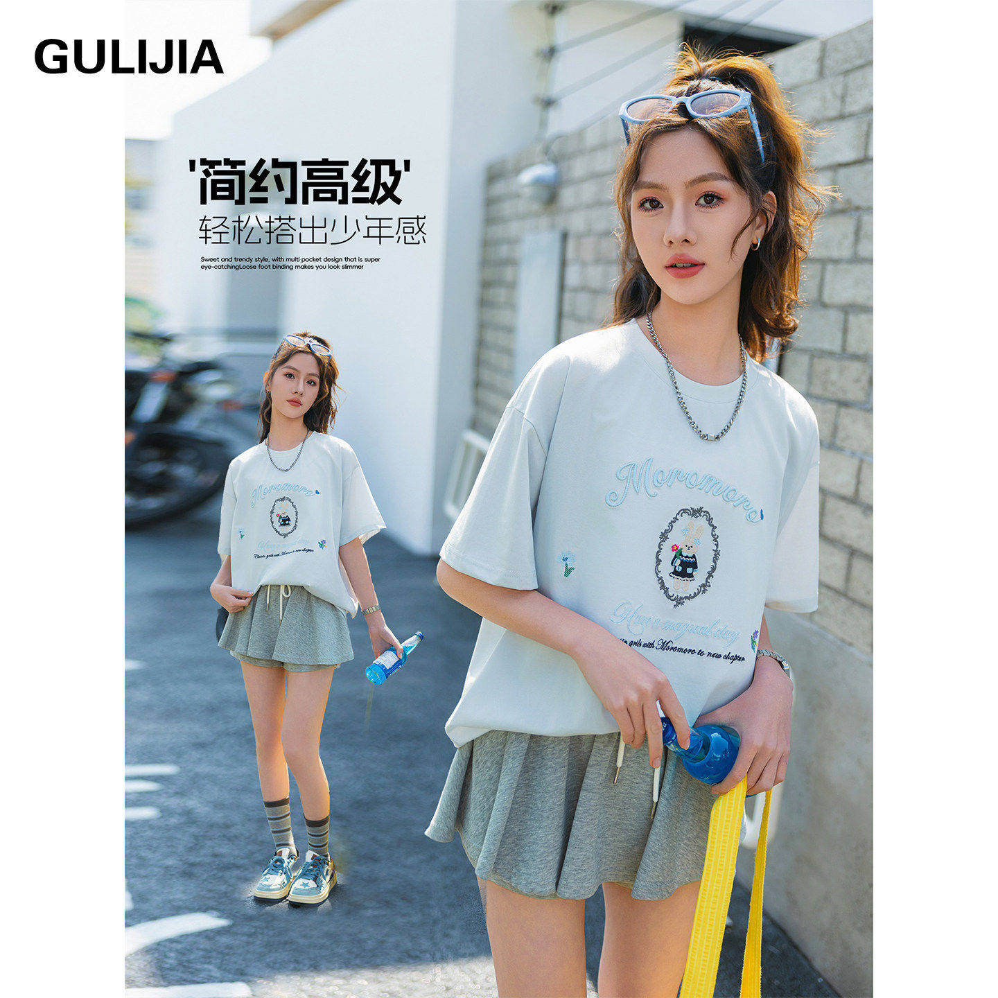 优蜜屋夏装印花短袖T恤女大童圆领刺绣休闲上衣初中生白色体恤衫