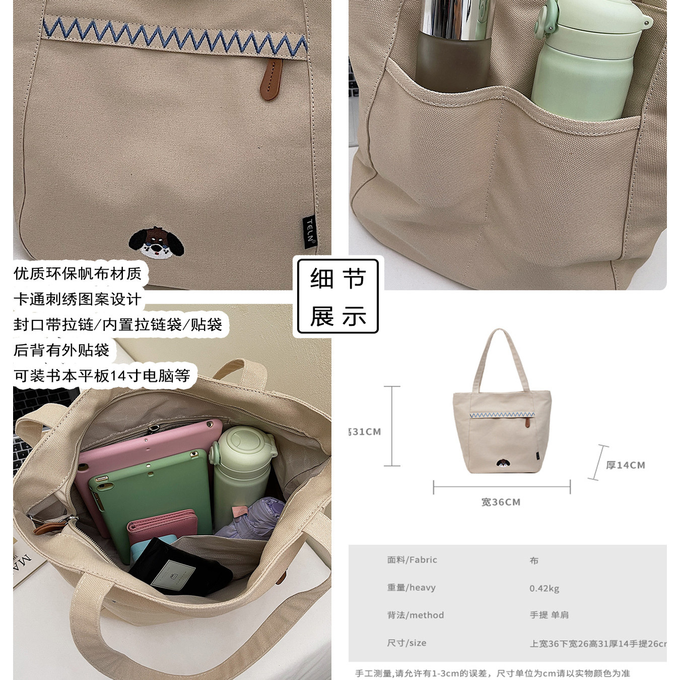 包包女大容量小狗刺绣托特包学生手提上课上班通勤包带拉链帆布包