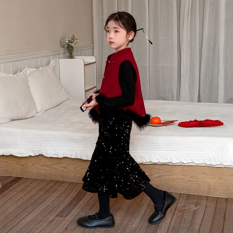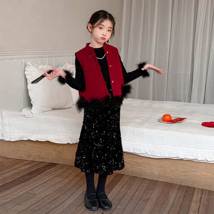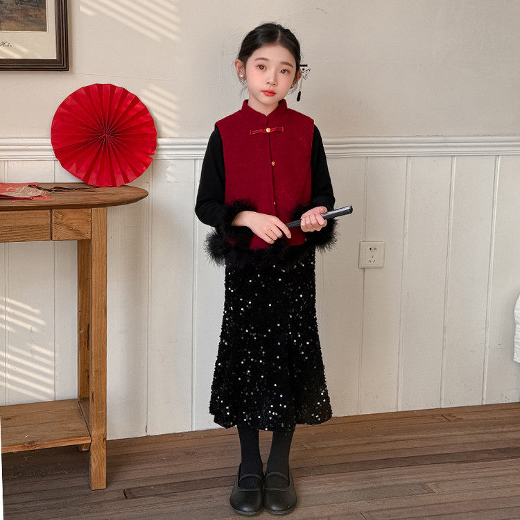 女童中国风拜年服套装2026新款儿童红色马甲国风唐装女孩新年战袍