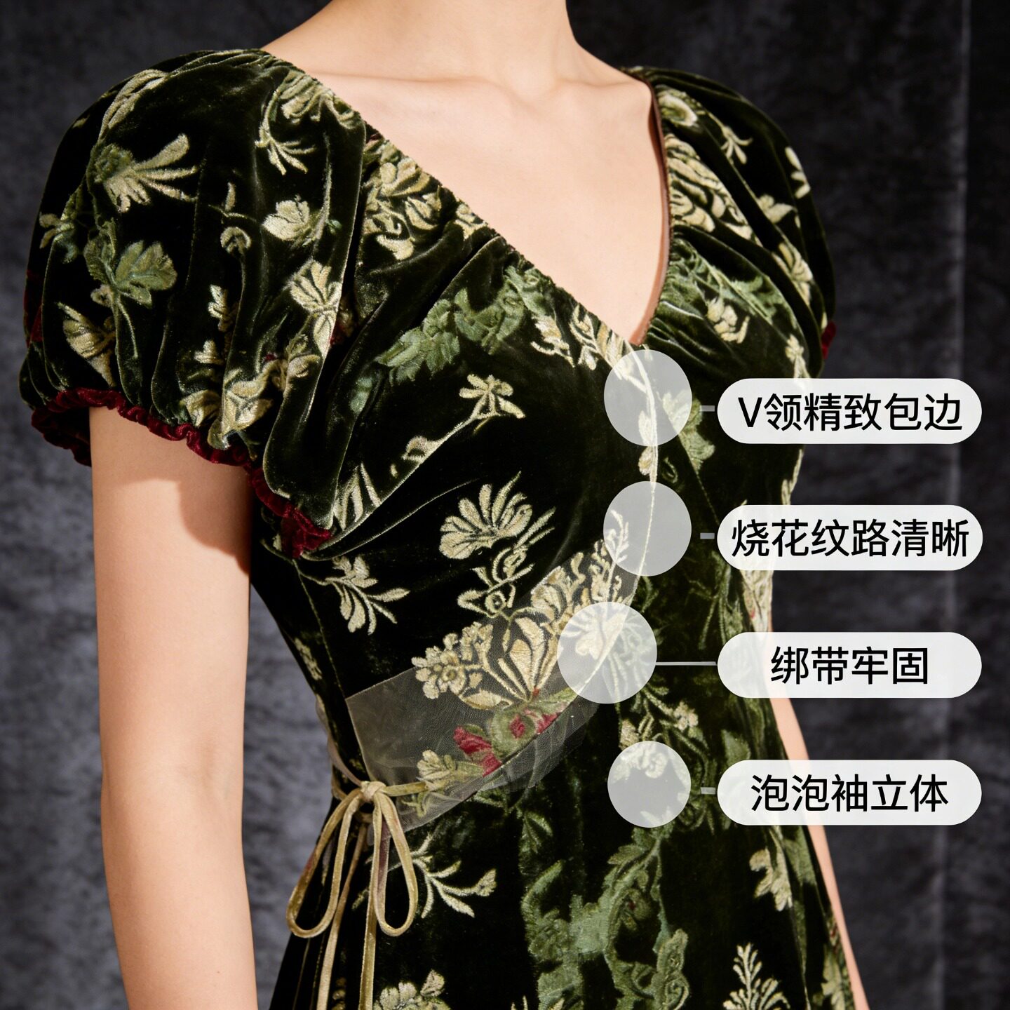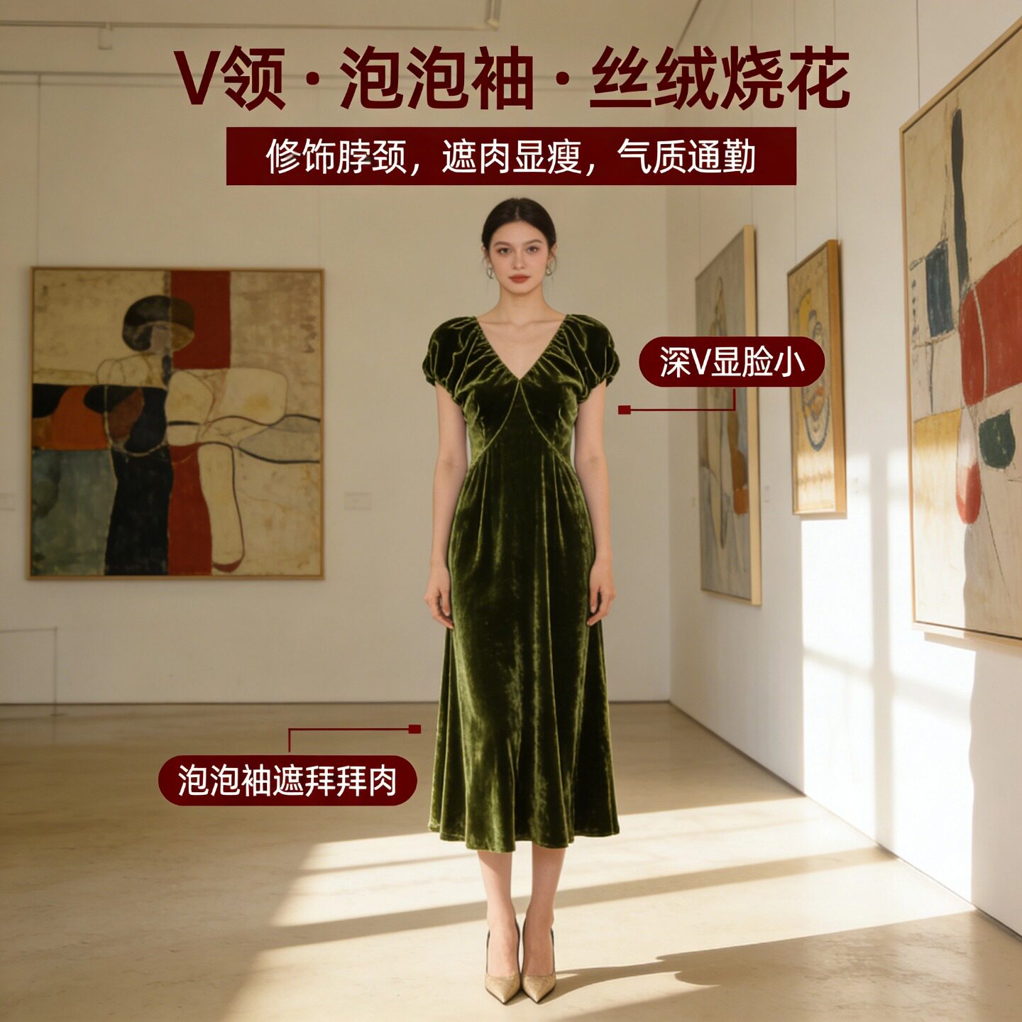 梨型身材掐腰连衣裙绿色短袖收腰薄纱女夏季巨好看V领丝绒A字裙