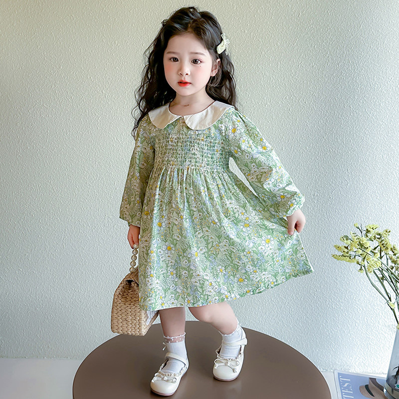 女童娃娃领碎花连衣裙收腰公主裙长袖花青语香连衣裙超甜美可爱