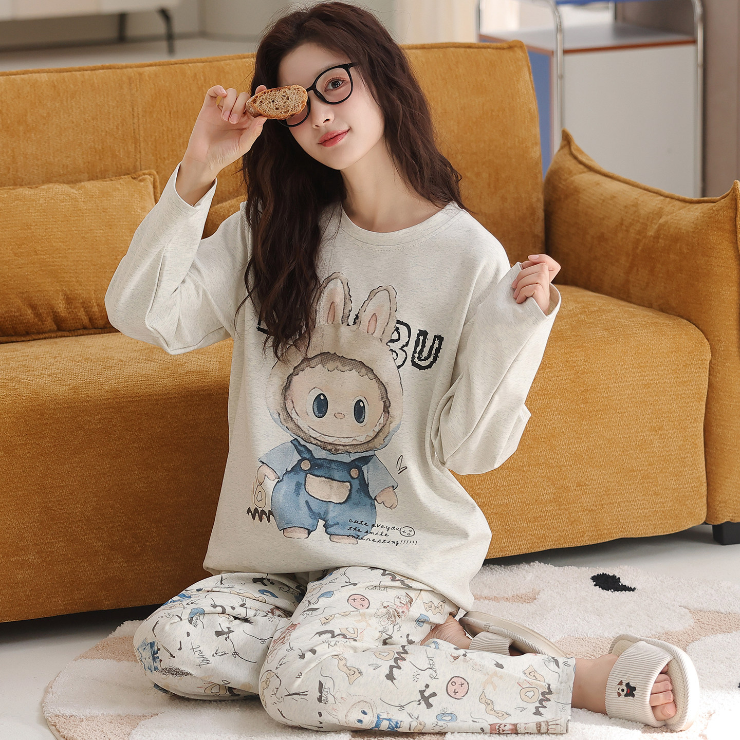 卡之恋秋季睡衣女款长袖加厚带胸垫冬纯棉布料100全棉学生家居服