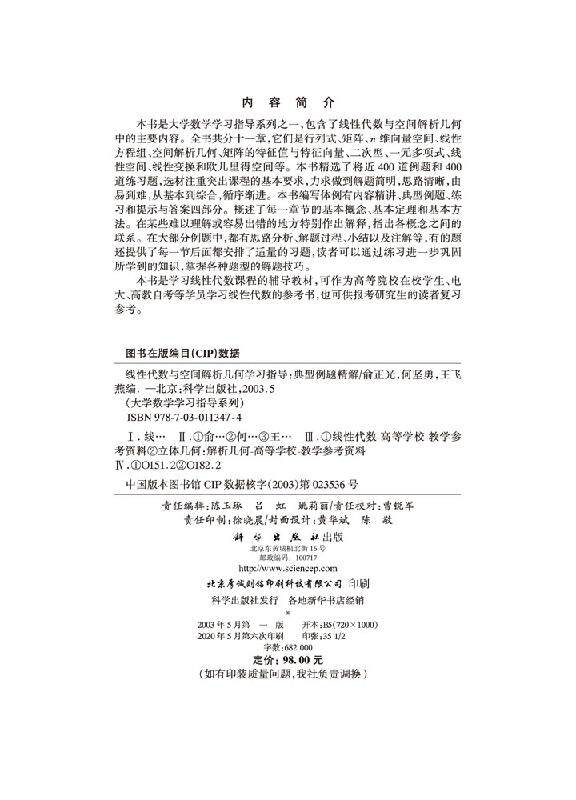 线性代数与空间解析几何学习指导----典型例题精解俞正光 等编 科学出版社9787030113474