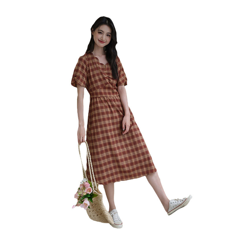 311线报网描述:桔梗法式V领格纹连衣裙显瘦气质收腰a字长裙